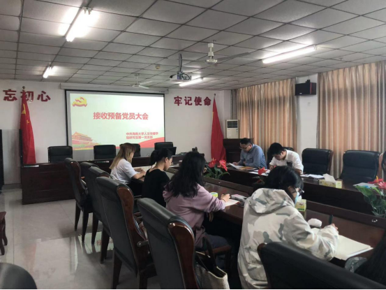 会议第二项内容,是党支部书记公衍峰主持的预备党员接收大会。首先,预备党员程立源同志、欧阳丽娜同志、王德之同志、徐梦依同志、孙露箐同志依次介绍个人履历;随后,他们现场抽取答辩题目并进行作答;并且他们的入党介绍人说明其相关情况,支部成员陈述入党意见。