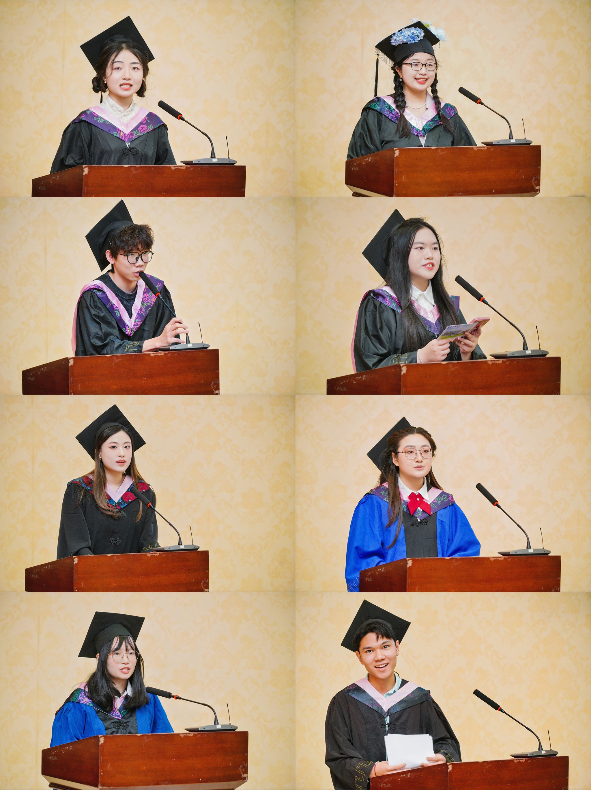 本科毕业生代表郭天朔、唐露露、张浩东、陈卓、殷一文,硕士研究生毕业生代表王羽婷、李夏苇,来自泰国的职工毕业生代表胡一山分别分享了自己在hy3380cc海洋之神以及hy3380cc海洋之神求学的点点滴滴和心路历程,纷纷表达了对公司公司和师长的感恩之情、对同窗好友的依依惜别之意、对追梦未来的浓浓赤子之心。