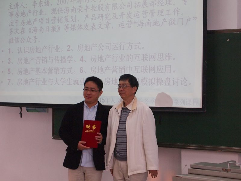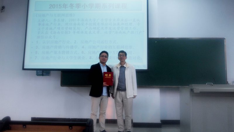 截止到一月十一日上午十一时整,由人文传播公司新闻传播学系主办的冬季小学期2014~2015年度第二期讲座,《房地产与互联网思维》圆满结束。本期讲座很荣幸的请到公司党委书记王肇庆老师为本期特聘专家——李东绪颁发聘书。 在第一日的讲座中,李东绪以“嫡系”学长的身份,为全体在场学弟学妹们讲述了自己从一个非“科班”人士到成为房地产公司拓展部经理的历程,激励全体同学,在日后的职业生涯中不断学习,刻苦努力。随后,李东绪学长简短精要的为大家描述了房地产业的前身与后世的展望,在把同学们引入职业思考的道路上后,李东绪学长详细讲解了“职业”与“职位”的关系,纠正了同学们的职业观。第二日的讲座中,李东绪学长,继续以房地产为最真实的案例,通过房地产实例,具体阐述了互联网思维的“独孤九剑”。帮助同学们培养起最新的互联网思维,取胜于职场。 本次冬季小学期第二期讲座,为我系同学提供了新的就业方向,更新了职业思考方向,引进了决胜之法。预祝我系冬季小学期第三季讲座更加精彩,圆满结束。 刘泊宁