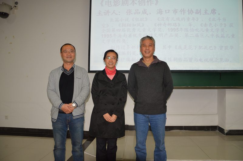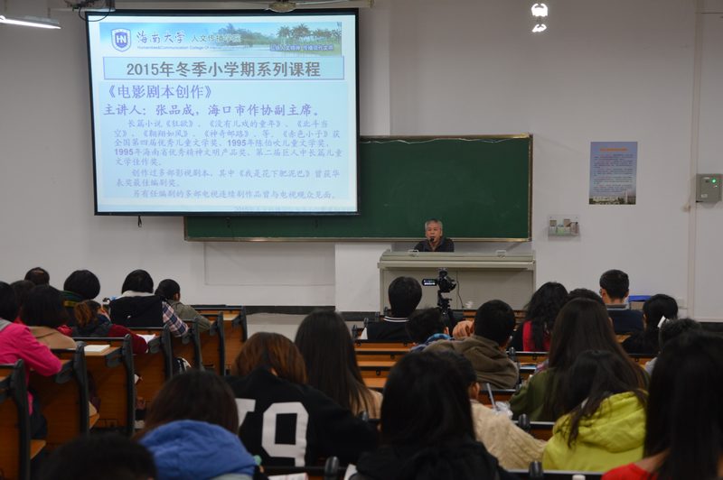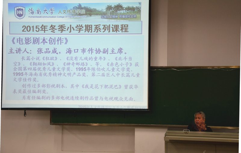 2015年1月7日晚,人文传播公司冬季小学期之《电影编剧》课程在5教311教室顺利开讲。此次课程由海口市作协副主席张品成老师授课。张品成老师是国家一级作家、编剧,曾获得中国作家协会第四、五届全国优秀儿童奖,“陈伯吹儿童文学奖”等奖项,拍摄完成的电影作品有《纸蝶》《鬼追命》等,编剧的电影《我是花下肥泥巴》获第十三届中国电影“华表奖”优秀编剧提名奖。 此次课程张品成老师围绕着电影编剧相关理论和实践进行授课。课程开端,张品成老师着重为公司戏剧影视文学专业的同学们讲解了电影编剧的技巧,讲解详略得当,并结合其自身丰富的经验给同学们专业指导。接下来,张品成老师针对电影剧本和小说的联系与区别进行讲解,以专业的眼光深入分析了小说对电影编剧的影响,同时也阐述了小说和剧本之间存在的差别。整个讲课过程中,张品成老师不断结合自身经验与体会,结合具体案例,激发同学们的学习兴趣,取得了良好的学习效果。 课程最后,张品成老师就编剧方面的就业信息与同学们进行分享。同时,同学们也热情参与,整个课程在紧凑、认真和积极的氛围中结束。 文字报道:王丛丛