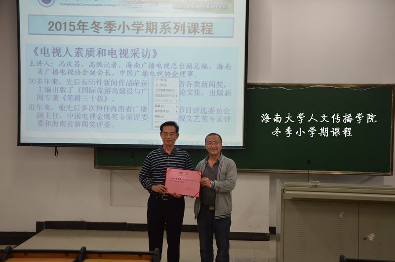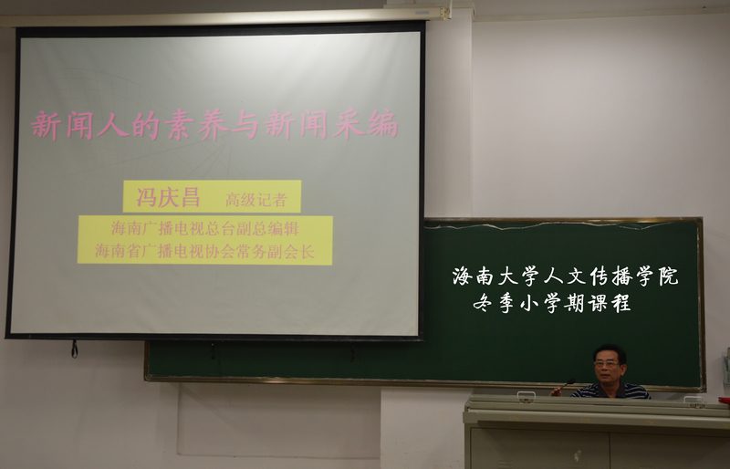 1月6日晚,hy3380cc海洋之神人文传播公司冬季小学期之《电视人素质及广播电视采访》课程在5教311开讲,主讲人为海南 广播电视总台副总编辑、中国广播电视协会理事冯庆昌老师。人文传播公司鞠斐教授为冯庆昌老师颁发聘书。 冯庆昌老师在课程中通过从事新闻行业30余年的经验心得,向在场师生介绍了中国当代新闻事业的侧重点和突出点,强调“坚持新闻的政治观”、“坚持新闻的导向观”、坚持新闻的真实观”、“坚持科学准确的监督观”、“坚持走转改工作”等重要方面。同时,他结合《65载看中国》等具体新闻片分析了广播电视吸引观众的基础和要点。 参加本次课程的刘同学说道:“本次课程内容贴近我们的专业学习。我们即将毕业,通过冯老师的讲座能够真正了解导自己的优势和不足,为以后的人生规划做好准备”。 据悉,冯庆昌老师从业30多年来,先后有55件新闻作品荣获全国和全省各类新闻奖,多次担任海南省广播电视优秀节目评选委员会副主任、中国电视金鹰奖专家评委、中国电视文艺奖专家评委等相关职务。