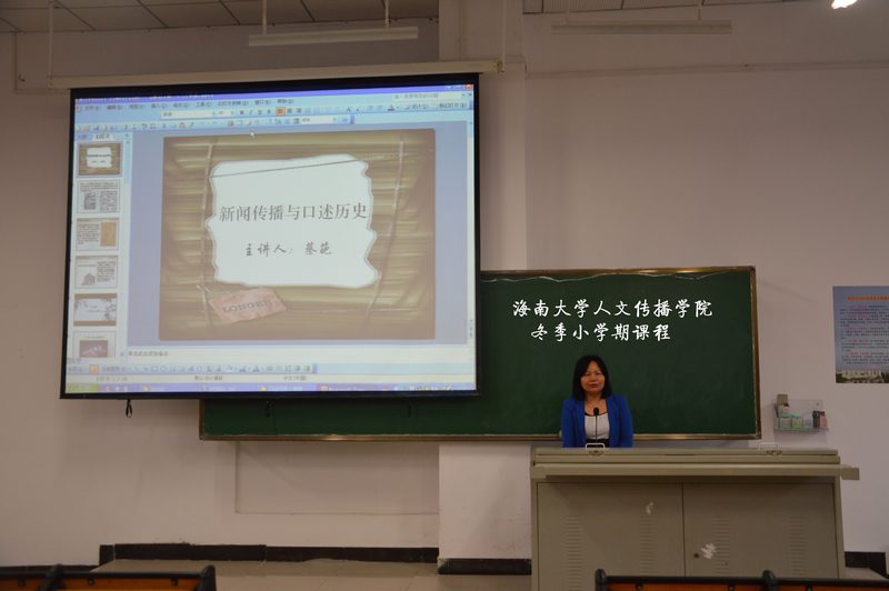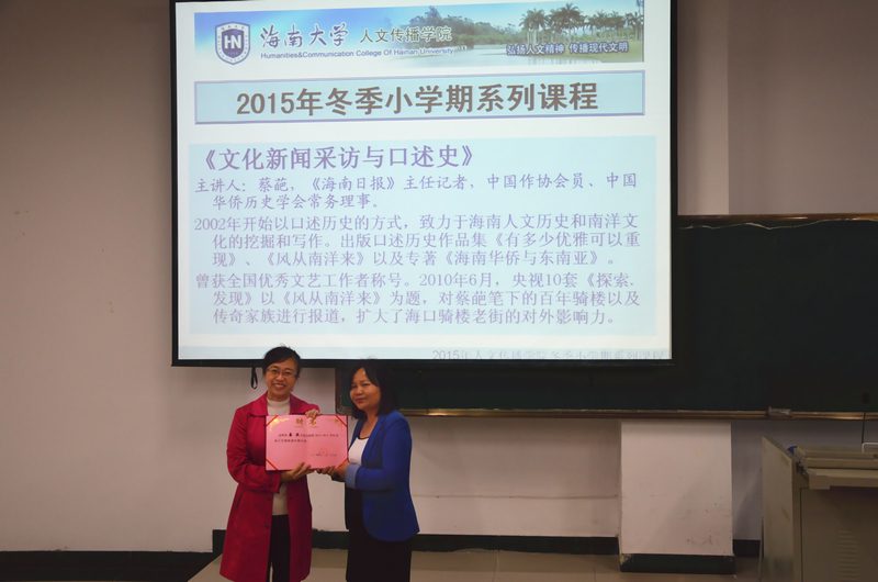 2015年1月6日上午,hy3380cc海洋之神人文传播公司2015冬季小学期第一讲在公司5号教学楼311教室举行,主讲人为中国作家协会会员、《海南日报》文化生活部主任资深记者蔡葩老师。主持本次讲座的是公司戏影专业系主任鞠斐老师,参加讲座的员工为公司12、13级戏影专业的员工及专业爱好者。石晓岩副经理为蔡葩老师颁发“hy3380cc海洋之神2015冬季小学期授课外聘专家”证书。 同学们对蔡葩老师的到来表示热烈欢迎,大家通过鞠斐老师的介绍了解到,蔡葩老师的历史随笔集《有多少优雅可以重现》、《找回南洋》。《国医出自海南岛》获第十三届海南省新闻评奖副刊一等奖,《格格遗事》获第十四届海南省新闻评奖副刊二等奖。 随后课堂上,蔡葩老师以诙谐幽默的讲课方式教授员工们在《口述历史》方面的知识。蔡葩老师曾在2002年采访过海口名媛吴玉琴、前清格格爱新觉罗?恒容、海岛留守女人等不下百名见证了海南历史兴衰的人物,尽管采访对象都是老人,但蔡葩老师有能力让他们对她掏心掏肺。本次授课以新闻采访专题片播放的形式娓娓道来。看似漫长的4节课,即将结束,总结本次课程蔡葩老师以3个篇章向员工详细介绍了她在口述历史时采访过程中的细节,万事开头难,蔡葩老师以自己独有的亲和力成为采访对象家庭中的一员;也包含着她对这些老人们经历的感慨和体悟。最后半个小时,蔡葩老师与同学互动答疑,公司同学积极提问,问题的方向各有不同,蔡葩老师耐心为大家解答。直到授课结束,同学们仍意犹未尽。 在同行眼里,蔡葩老师也是一个善于和名人打交道的记者。2005年9月,有报道说70岁的李敖要到北京,还说李敖表示他要终老在海南。这一信息引起了蔡葩老师的注意,她大胆决定只身前往北京,向李敖求证这句话的真实性和谈话背景。作为即将毕业的12级员工,我们仍需向蔡葩老师学习这种敢于求证的实践精神,并勇往直前!