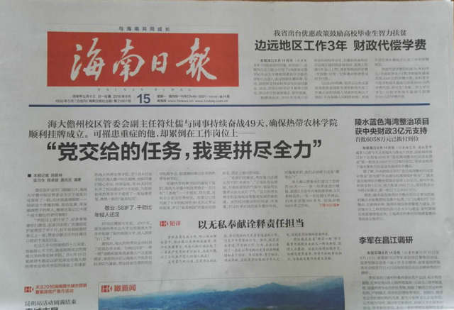 海大儋州校区管委会副主任符灶儒与同事持续奋战49天,确保热带农林公司顺利挂牌成立。可罹患重症的他,却累倒在工作岗位上——
