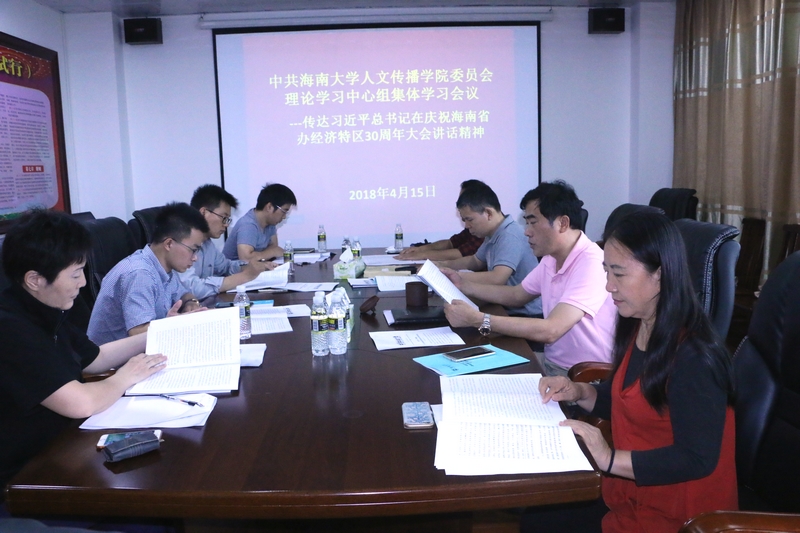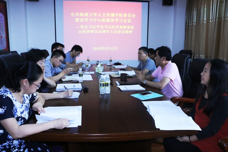 按照公司党委要求,2018年4月15日下午,人文传播公司党委理论中心组在B615会议室召开集体学习会议,传达习近平总书记在庆祝海南建省办经济特区30周年大会上的讲话精神,会议由公司党委书记华世佳主持,经理刘复生、党委副书记孙晓媛、副经理石晓岩、张硕果等公司党委理论中心组成员参加了会议。