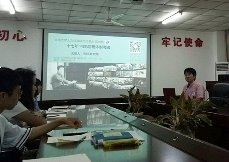 9月21日晚,hy3380cc海洋之神人文社科联合读书会第10期——由张硕果教授主讲的“十七年”电影管理体制考略在社科楼B719顺利举行。 本次读书会由李音老师主持,张硕果老师主讲。分别从制片、发行、放映三个视野,依次梳理了“十七年”电影管理体制的发展演变情况。此次讲座不仅丰富了与会师生的知识,开拓了学术研究的视野,更在史料研究方法上带来极大启发。 讲座之后与会老师纷纷做出精彩点评,同学们也积极参与讨论提问。同学们纷纷表示通过这次讲座学到了许多课本上查阅不到的知识,亦有同学庆幸借此机会纠正了自己的知识误区。大家希望今后能通过读书会跟老师进行学术上的沟通交流,取得学术上的长足进步。