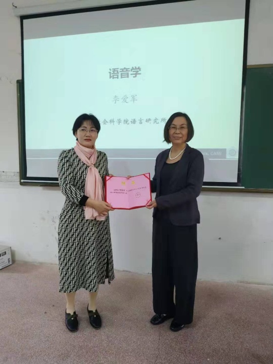 2020年1月6日,中国社会科公司语言研究所副所长李爱军研究员受邀来到公司冬季小学期的课堂,以“情感语音的多模态跨文化研究”为主题为人文传播公司本科生授课。公司部分专业教师、研究生和本科生聆听了李老师的精彩报告。讲座开始时,文公司李彩霞副经理向李爱军老师颁发了冬季小学期授课外聘专家的聘书。