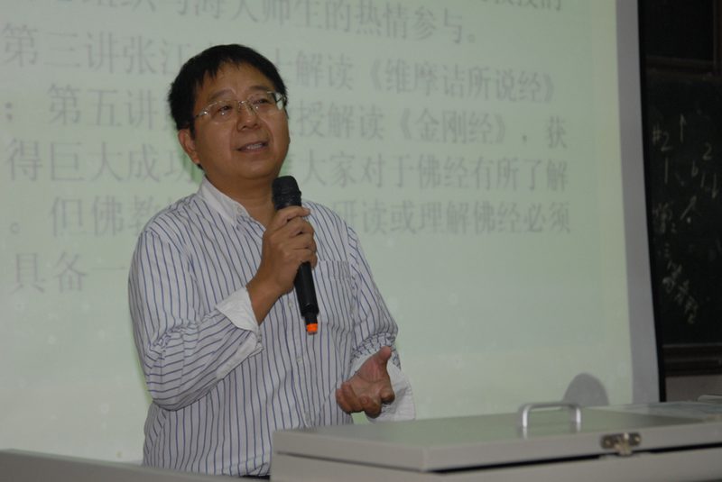 2012年10月28日晚八点,东方经典系列讲座第七讲如约开讲,本讲盛情邀请到华中师范大学文公司古典文献学博士生导师、《华中学术》主编张三夕教授担任主讲,讲解大乘佛学另一部重要经典《楞严经》。《古典与现代》主编杨国良教授主持本场讲座。 在主持开场中,杨国良教授向听众详细介绍了张三夕教授的学术背景,并围绕张三夕教授重视学术承传的特点,重点介绍了张教授在带硕士生和博士生时所制定的“张门门训”。张三夕教授学术积淀深厚,学识渊博,曾先后受业于我国著名古代文史学家程千帆先生和文献学大师张舜辉先生门下,秉承业师大家风范,重视学术精神的承传。 “敬业乐群、守时守信、博而能一、厚积多发……”在现场听众两次齐诵中,“张门门训”见证着薪火相传的学术承继传统,也见证着张三夕教授敬业乐群,诲人不倦的师者风范。在开场中,张三夕教授也表达了对杨国良教授的谢意,感谢人文传播公司与《古典与现代》的盛情邀请,使得有机会回到原先工作过的hy3380cc海洋之神,与老朋友叙旧和做学术交流。 本场讲座张三夕教授以“定力与空性”为题展开对《楞严经》大义的解读。联系东方经典系列讲座第三讲张江南博士解读《维摩诘所说经》,第五讲熊开发教授解读《金刚经》,张三夕教授认为对于博大精深的佛学,研读和理解佛经应具备以下准备性的知识与经验做基础:一、对印度的历史文化、地理、风俗、语言等有一定的了解;二、要了解佛教的创始人释迦牟尼,能记清释迦牟尼的多个称谓和其十大弟子的名字;三、要能对佛家的基本教义和关键词有精到的把握和理解,如《楞严经》中所涉及的“六尘”、“六根”、“六入与六出”、“十八界”等;四、要了解佛教的分层与分期;五、本人应有一定的修行经验,特别是一种“内明”的体验;六、要明确佛经讲解释义中的风险,讲解佛经需要极高的佛学修养和内明实证功夫。 在一段专业性的指导之后,张三夕教授围绕《楞严经》的经名、因缘、历史地位及其价值展开讲解。《楞严经》全名《大佛顶如来密因修证了义诸菩萨万行首楞严经》,经名释义丰富。《楞严经》的传入和译介则有着传奇的经历,据载唐中宗神龙元年(705年),中印度僧人般剌密帝用极细的白毷(毛)写出《楞严经》,用蜡封妥,割开臂膀,潜藏皮下,传到中国。传说经四人之力,由当时宰相房融笔受润色,得以翻译面世。《楞严经》在佛经中是正法的代表,被誉为佛法的眼睛,经文集中反映了佛法的宇宙观、人生观、价值观,全面道出了佛法的本体论、认识论、实践论等诸问题,世人曾有“自从一读《楞严》后,不看人间糟粕书”之说。 在接下来围绕《楞严经》大义的解说中,张三夕教授首先指出《楞严经》的宗旨大纲和核心命题是:“信佛者面对无时无刻不在变化的 ‘尘根’,如何离尘脱根,直指人心,修炼坚固的楞严大定,从肉身中发现不生不灭的空性。”全经解行并重:前四卷是“解”,是经文的重点和主体部分;后六卷是“行”或“证”(修行或修证)。接着张三夕教授重点围绕第一二卷的主体内容:“七处征心”、“十番显见”展开讲解,在其看来“七处征心”重点辨析一个心性本体论问题:心在何处?而“十番显见”则是在辨析一个心物认识论问题:何为见性?如果说“七处征心”是破妄,那么“十番显见”则是显真。在对“十番显见”的讲解中,张三夕教授以机智的佛学比喻使听众体悟到显见即“见性”,我们自性即“空性”中“能见的功能”不依赖眼睛和任何物质条件而独立存在,是永恒不息的生命之流。如何从肉身中发现不生不灭的空性是《楞严经》的核心问题。在张三夕教授看来,“十番显见”有多方面的现代启示意义:一、空性向每个个体承诺绝对自由,绝对自由转为永恒的生命理念。二、领悟空性并不意味着拒绝俗世事务。三、见性不因对象变化而变化,能见就是一种根性。四、人性是空性在生命体中的显现,人性同时也是空性的遮蔽。五、在感知“空性”中,世俗人生也需要定力、空性的修证。六、通过楞严大定的修炼而透彻领悟空性,将空性的领悟转化为日常的道德自律,值得去思考,也不失为当下中国人丧失道德底线(即丧失定力)的解决方案之一种。七、阅读《楞严经》,要领略语言的精准、美妙,值得涵泳和学习。 讲座的最后张三夕教授借用南怀瑾先生《楞严大义序》中的一段话祝福现场听众:悟得真实智慧解脱的真理,使这个颠倒梦幻似的人生世界,能升华到恬静安乐的真善美之领域。张三夕教授的博学宏富和充满激情的精妙讲解获得了全场听众起立长时间雷鸣般的掌声。在互动环节,张三夕教授还热情的回应解答了听众提出的各类问题。