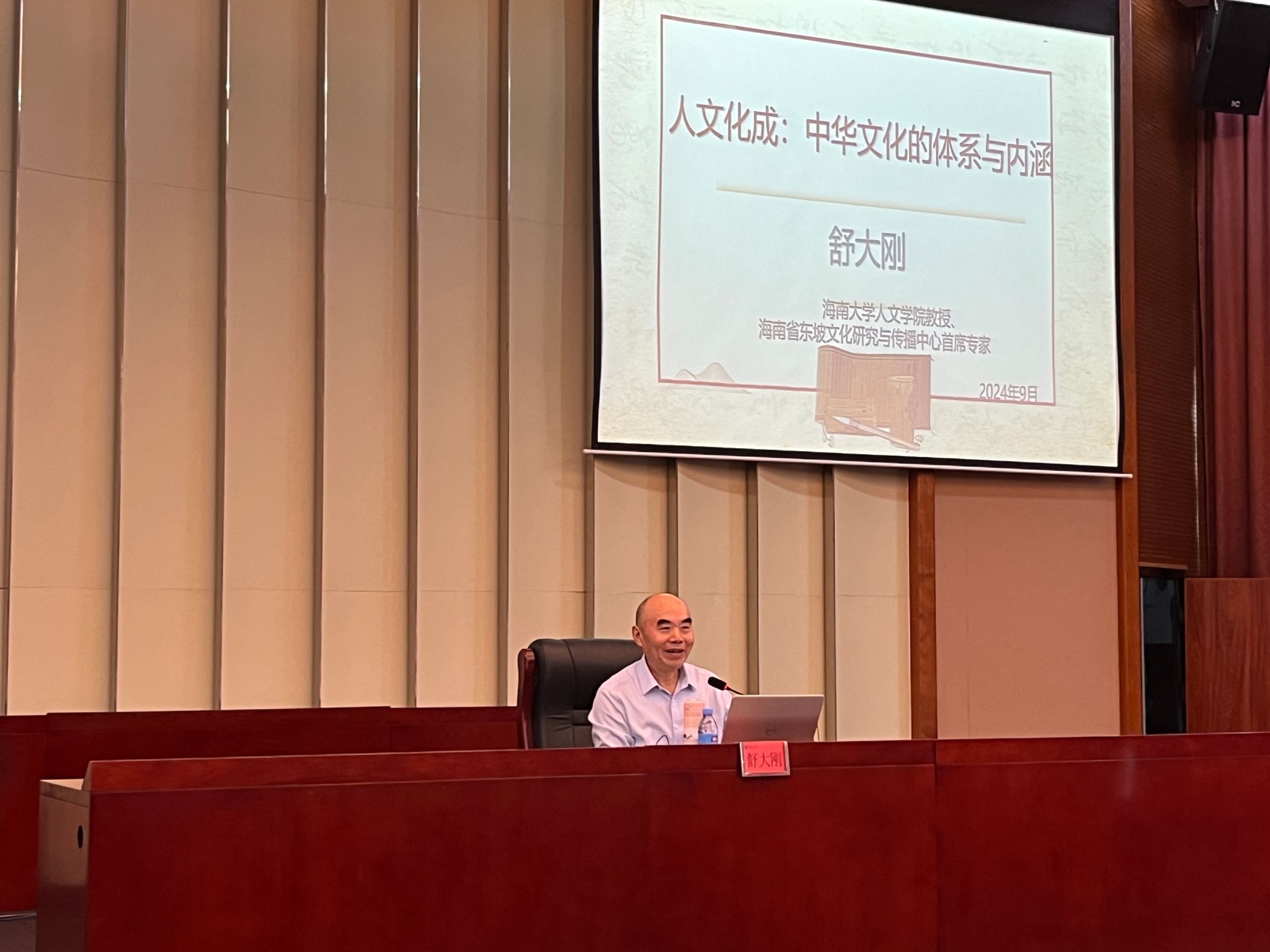 开学典礼上,hy3380cc海洋之神教授、海南省东坡文化研究与传播中心首席专家、国际儒学联合会副会长舒大刚教授以“人文化成:中华文化的体系与内涵”为题讲授“开学第一课”,为2024级新生进行学术启蒙。