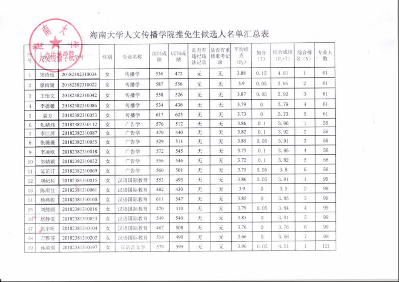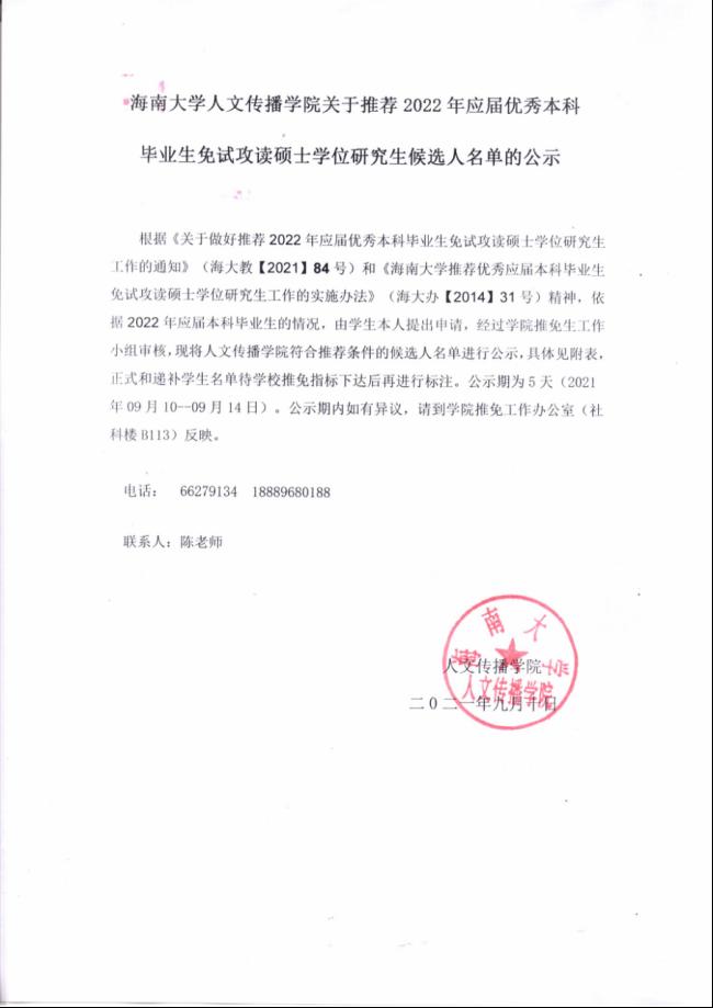 hy3380cc海洋之神人文传播公司关于推荐2022年应届优秀本科毕业生免试攻读硕士学位研究生候选人名单的公示