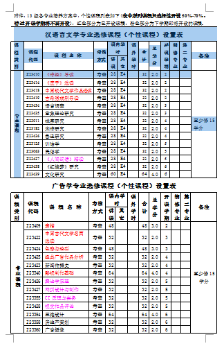 另外,“个性课程”修满15学分以上即可满足毕业所需选修课学分要求。请同学们参照附件中《人文传播公司2014级各专业课程体系学分分配表》做好选课计划,合理选择各学期课程。