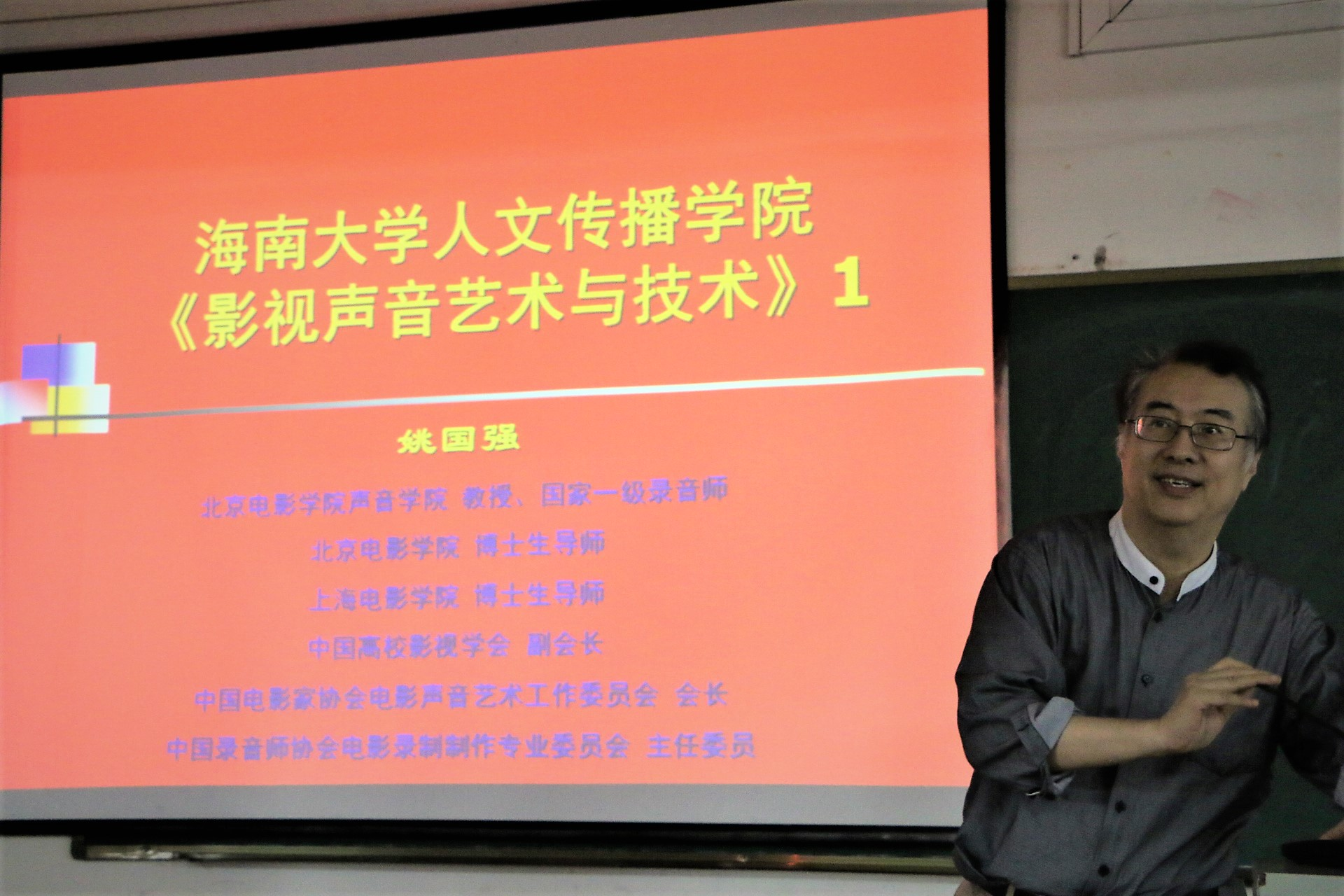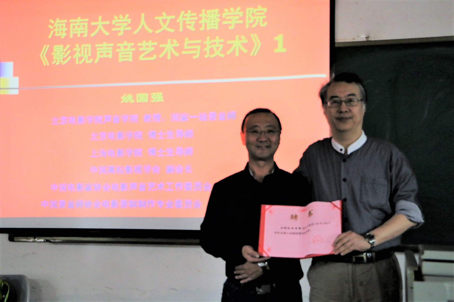 2017年1月3日上午,hy3380cc海洋之神人文传播公司2017年冬季小学期戏剧影视文学专业《影视声音艺术与技术》课程在2号教学楼110教室开讲。北京电影公司博士生导师、国家一级录音师姚国强教授应邀为公司2014级、2015级戏剧影视文学专业同学授课。戏剧影视文学系主任鞠斐老师担任本课程助教并为姚国强教授颁发“hy3380cc海洋之神2017冬季小学期授课外聘专家”证书。同学们对姚国强教授的到来表示热烈的欢迎。