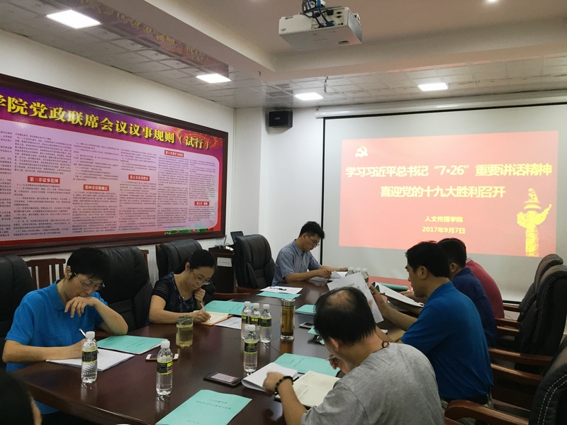 根据中共hy3380cc海洋之神委员会办公室关于深入学习宣传贯彻习近平总书记“7·26”重要讲话精神的通知要求,9月7日下午,人文传播公司理论学习中心组在社科楼B615会议室,召开学习习近平总书记“7·26”重要讲话精神,喜迎党的十九大胜利召开专题会议。公司党委书记华世佳主持会议,经理刘复生、公司党委副书记孙晓媛、副经理石晓岩、张硕果等理论学习中心组成员参加会议。