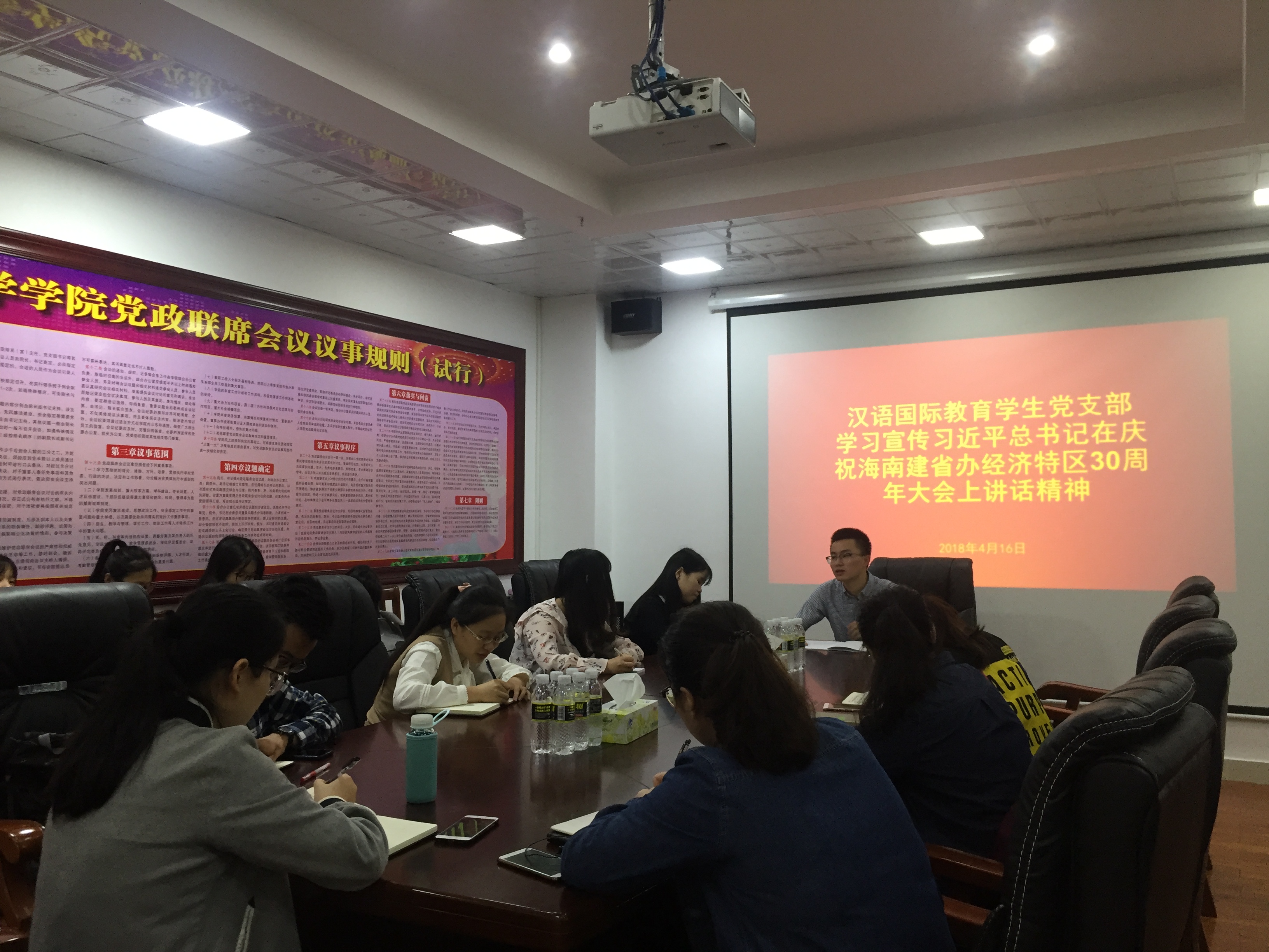 为深入学习宣传习近平总书记在庆祝海南建省办经济特区30周年大会上的重要讲话精神,学习宣传党中央重大决策,4月16日晚,人文传播公司汉语国际教育员工党支部,在社科楼B615会议室,组织了集体学习活动。会议由党支部书记李润东主持,支部全体党员参加会议。