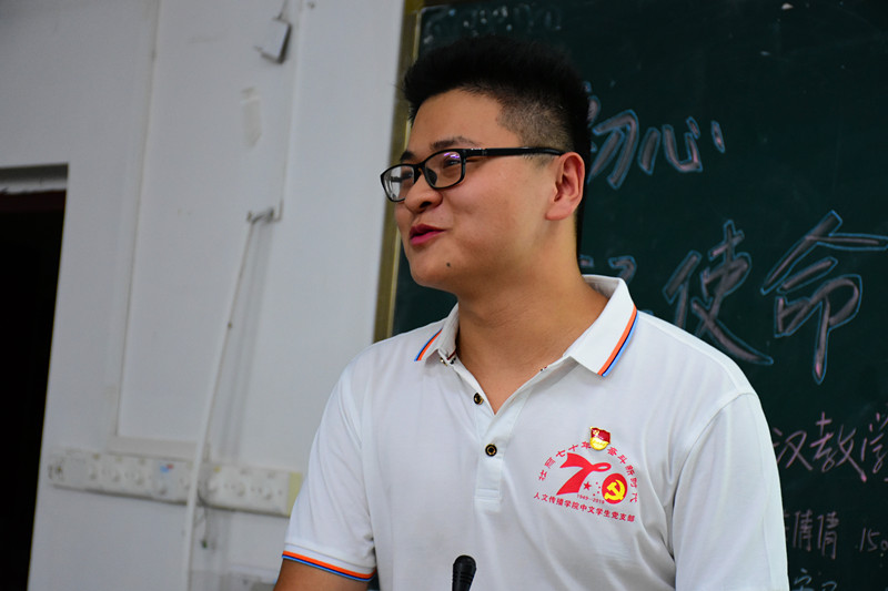 首先由2019级辅导员李洁老师作相关介绍,接着支部支委与党员代表向新生们做自我介绍以及党员经验分享,组织委员陈倩倩同志希望新生有困难找党员,有问题找支委,纪检委员郭钱明同志鼓励大家早点加入党支部,高闻同志分享了自己的党员经验与学习经验。新生们积极与党支部代表提问互动。随后,由宣传委员王宏民同志向朝气蓬勃的大一新生讲解入党申请书书写格式,中文员工党支部副书记郭瑞鹏同志向各位新同学介绍发展党员的要求与流程,并以其他党员的事迹为例子,指出同学们需认真思考“我为什么要入党?”这个问题,正确的入党动机对未来人生道路的重要性并希望新生们可以合理规划大学四年的生活学习。至此,伴随着经久不息的掌声,大会步入最后一项,中文员工党支部、汉语国际教育党支部代表与新生们一同观看《榜样》,学习优秀共产党人的精神,引导2019级新生对党有正确的认识,端正入党动机。