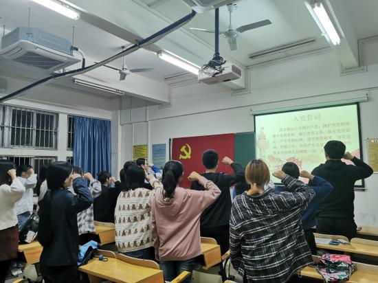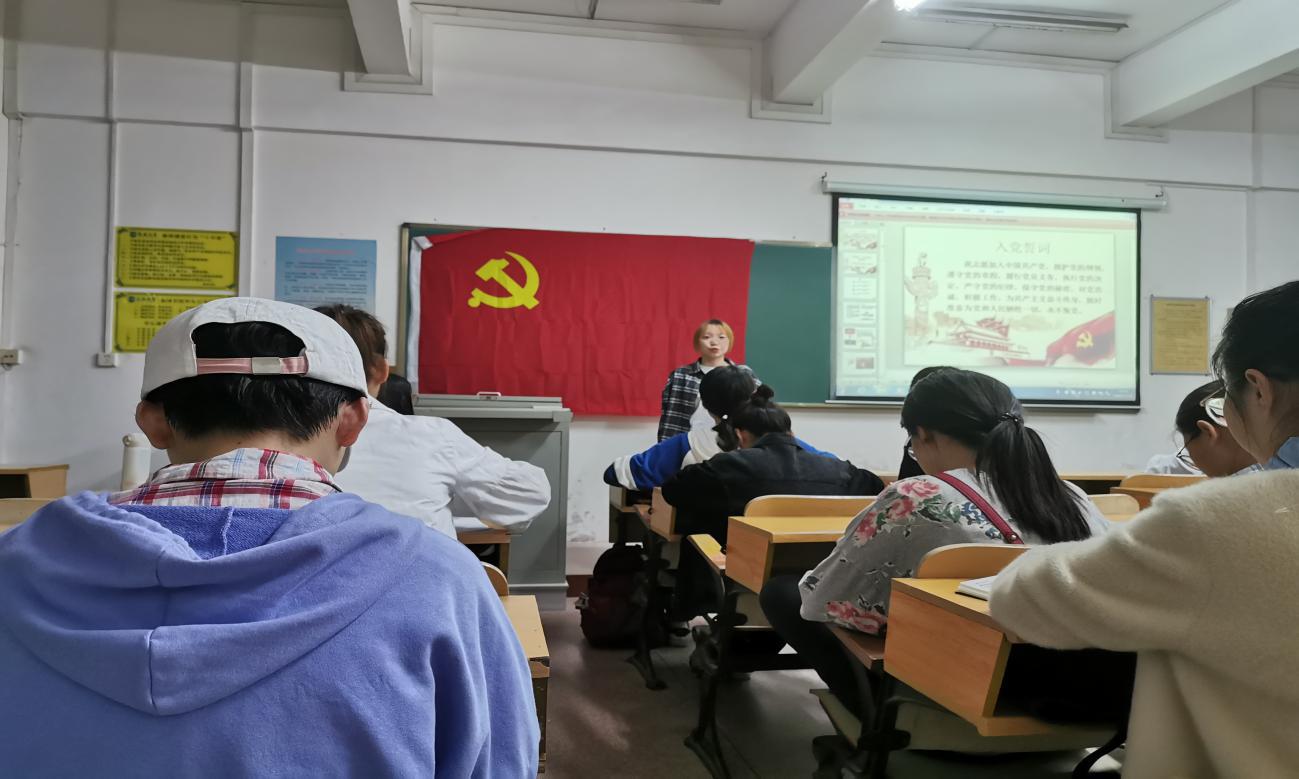 会议第一项,讨论是否接收黄珍珍、冉爱琳、陈佳风、杨静、马昱含、宋诗怡、叶艳、陈昱晗、程潜9位同志为预备党员。本次会议由支部书记李洁老师主持,支部全体党员参加。会议严格按照党员发展程序流程,首先是入党申请人汇报自己的入党动机、本人履历以及需要向党组织说明的问题,然后入党介绍人介绍发展对象的基本情况,再由支部委员会向支部大会报告发展对象的审查情况。本次会议采取不记名投票方式,公平公正。其次,经过以上流程,支部大会一致同意接收黄珍珍、冉爱琳、陈佳风、杨静、马昱含、宋诗怡、叶艳、陈昱晗、程潜9位同志为预备党员。在支部书记的带领下,全体党员一起面向党旗进行入党宣誓。最后支部书记对党员同志们的努力给予充分肯定,也对新加入党组织的同学提出要求,希望各位党员同志认真习读党章,加强党性修养的锻炼,努力发挥党员先锋模范作用。