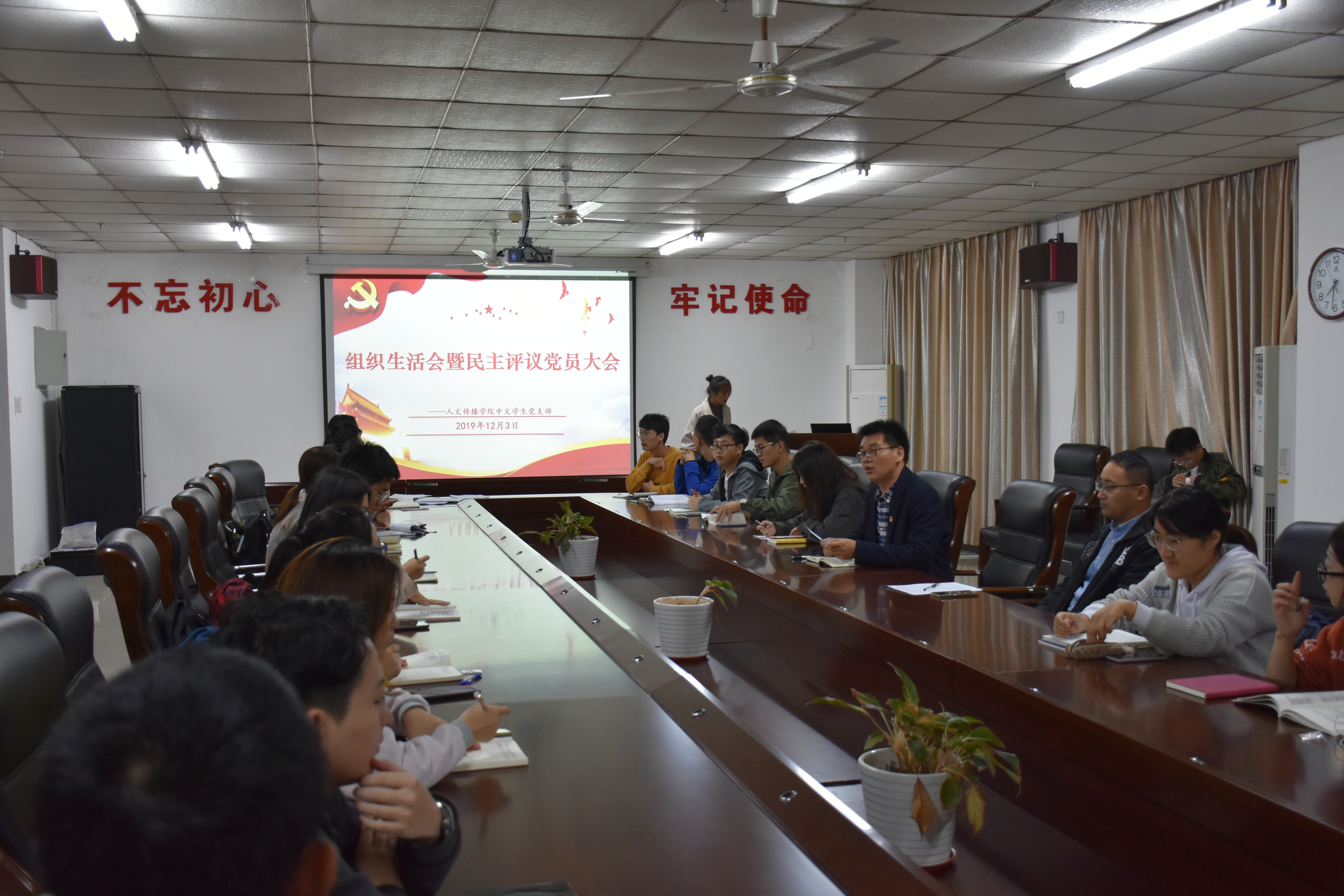 为贯彻落实“不忘初心、牢记使命”,不断提高党员的自我净化与自我完善能力,人文传播公司中文员工党支部于2019年12月3日晚19:30在社科楼b719召开组织生活会,公司党委委员公衍峰老师受邀出席,全体党员、预备党员与三名群众代表参与此次会议。