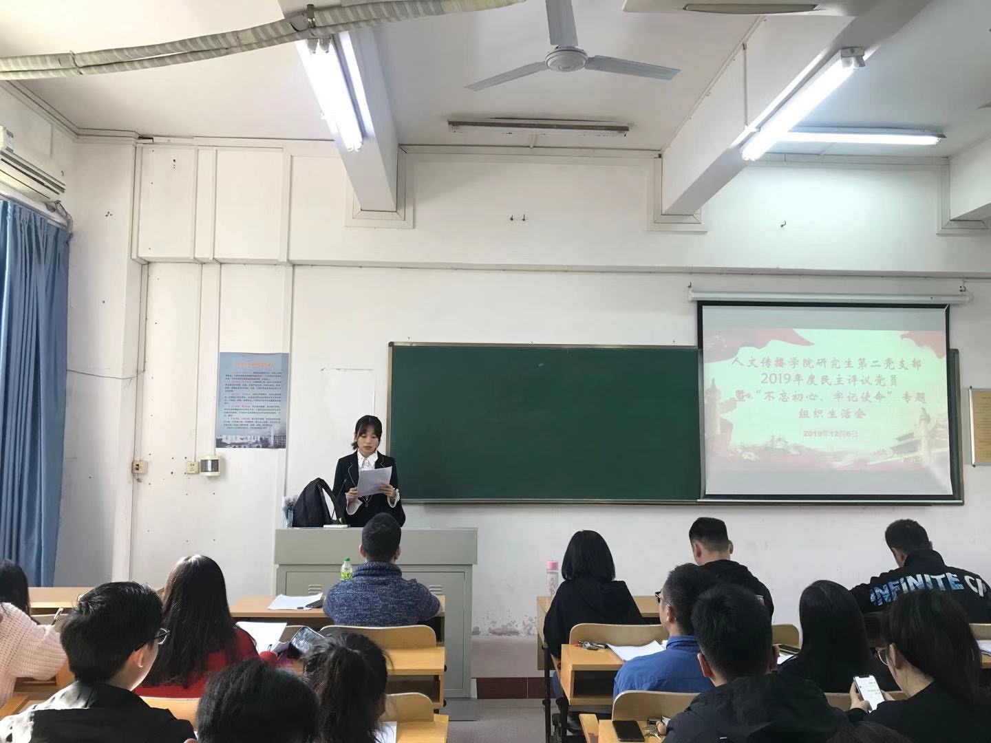 2019年12月6日下午3点,人文传播公司研究生第二党支部在2教206召开组织生活会和民主评议党员大会。会议由党支部书记宋鸽主持,人文传播公司研究生第一党支部书记公衍峰出席会议,研究生第二党支部全体党员、预备党员以及部分积极分子参加会议。