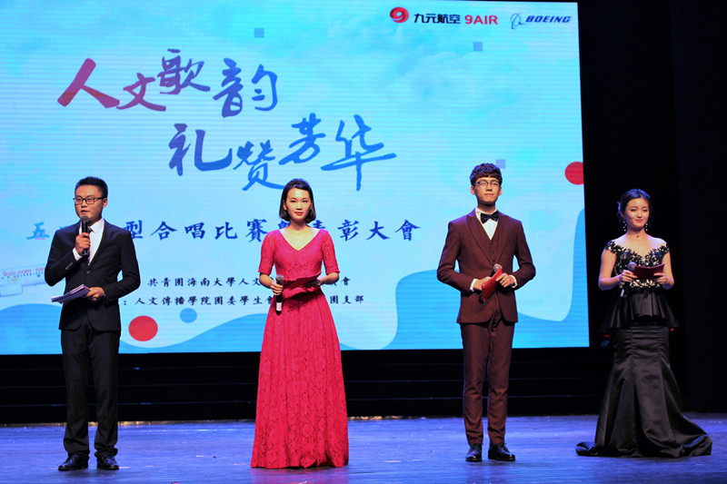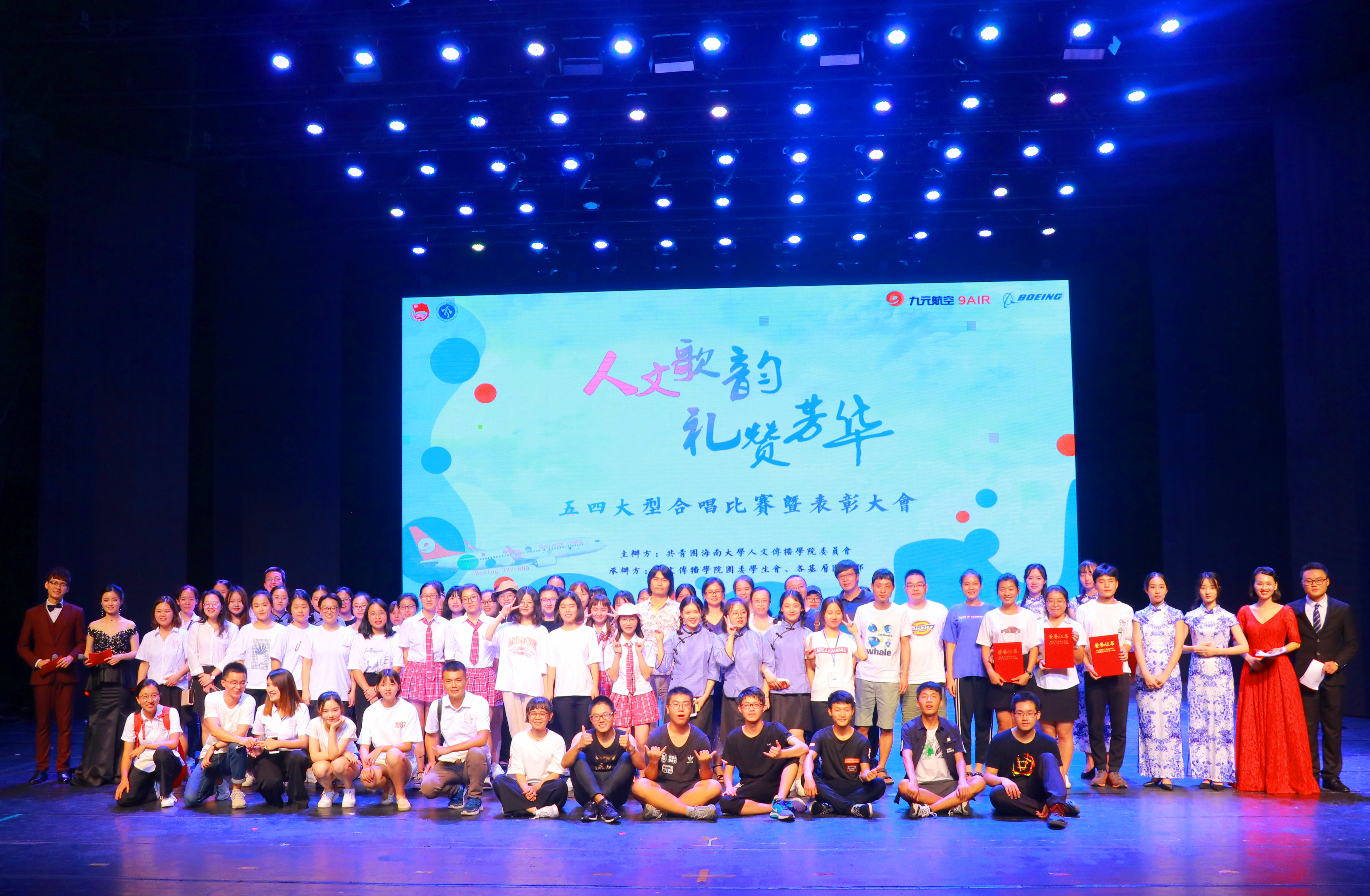 晚会正式开幕前,首先播放了人文传播公司团委一年以来的回顾总结视频,展示了人文团学风采。五四大型合唱比赛暨表彰大会在Air音乐社特邀嘉宾的歌曲表演中正式拉开帷幕。本次晚会由各年级各专业分别派出一支团队以合唱比赛的形式向观众呈现,由评委进行打分,最终评选出各参赛队伍的名次。整场晚会高潮迭起,互动不断,给在场的观众带来了一场精彩的视听盛宴。15级汉语国际教育带来的歌曲串烧《side to side》充分彰显了当代新青年大胆而自信的姿态;16戏剧影视文学专业的同学带来的朗诵与合唱《恰同学少年》,带我们回味了芳华少年;17级新闻传播学类同学的歌舞《不忘历史不负芳华》以旁白、舞台剧、合唱的形式,展现了不同时代的青春歌韵;中场由笑声工作坊的同学演绎的相声《绿色出行》号召我们践行绿色环保,在笑声中享受绿色生活;17级戏剧影视文学专业带来的合唱《上下五千年》,向我们展示了华服之美,再现康桥之上徐志摩的思念;最后,伴随着团学青成员带来的歌舞串烧《明日不害怕》,本次合唱比赛表演环节圆满结束。在评委们公平、公正的评分下,比赛结果也在大家的期待中公布。17级戏剧影视文学队伍以本场最高分获得比赛一等奖。17级中国语言文学类一、二班,17级新闻与传播类一、二班凭着优异的成绩获得二等奖,其他各专业表演团队收获三等奖和优秀奖。此外,通过“海大人文青年”微信平台进行的节目网络投票评选的“最具人气奖”由16级戏剧影视文学专业队伍获得。