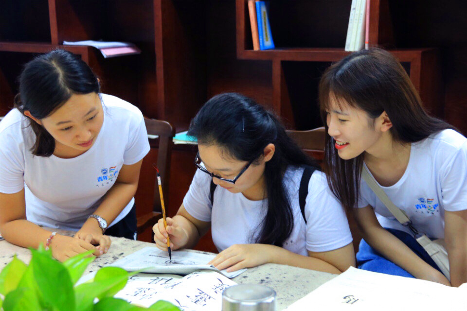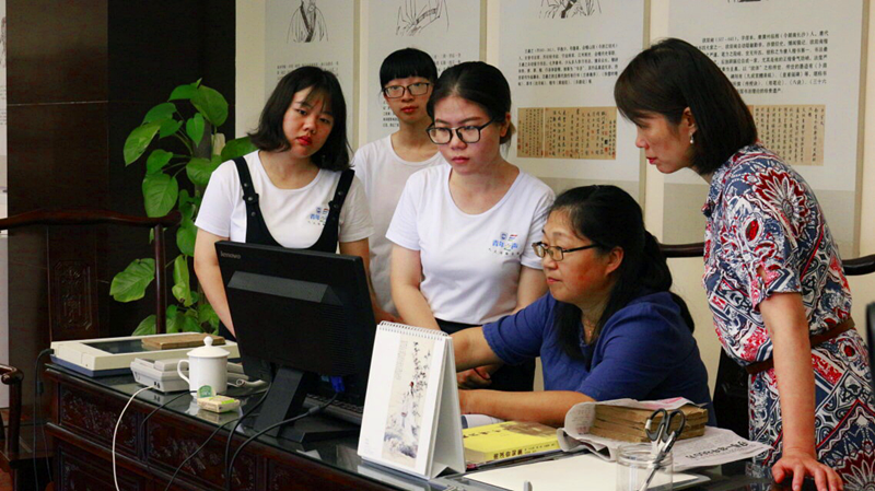 紧接着,在老师们的指导下,实践志愿者们有序开展古籍修复、文献加工、展馆讲解、汉字记忆等多项工作。负责古籍修复工作的黄文锋老师向志愿者们简要介绍了古籍修复的主要材料、工具、方法及注意事项,指导志愿者进行了线装书的制作与修补。在汉字记忆工作区,志愿者们发挥自己的书法优势,积极引导和鼓励读者用毛笔抄写《千家诗》、《古文观止》等经典,隶书、楷书、行书以及草书在宣纸上铺展开来,留下了许多散发着墨香的优秀作品。在这个过程中,志愿者和读者们更好地了解和体会了中华传统文化的魅力,领悟到了文化传承的重要性。