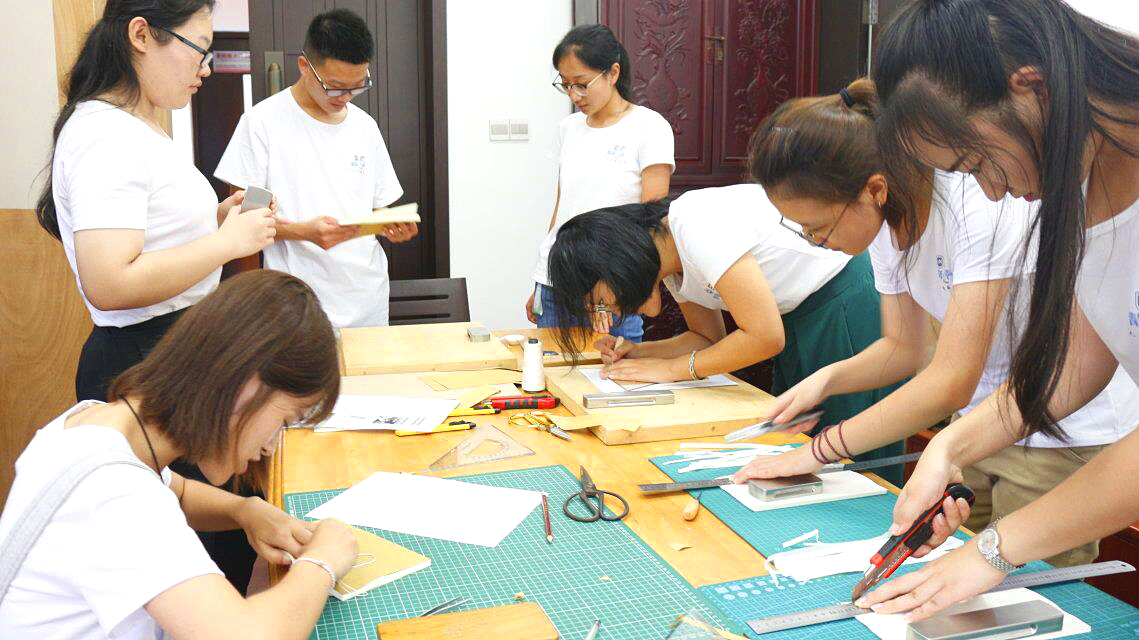 “身穿汉服讲解,着实是另一番韵味,自己也似乎是属于历史隧道里的小人物,讲述着历史。来这里的游客更喜欢观看装帧艺术,从甲骨文、简策装一步步发展到线装。其中简策装最为吸引人,也让我更深入地寻找资料了解简策装,为的是可以更好应答。”展馆组成员在实践日志中这样写道。