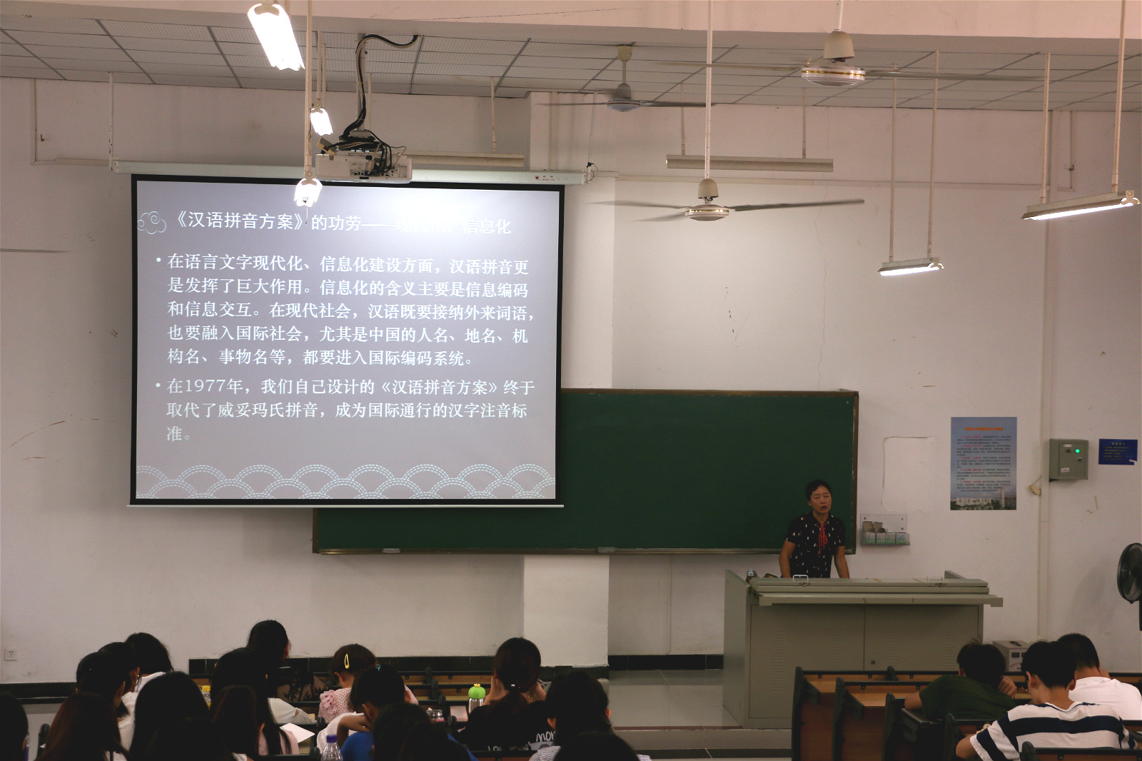 为深入宣传国家语言文字法规政策,大力推广普通话,优化公司语言文字环境,根据《教育部等九部门关于开展第21届全国推广普通话宣传周活动的通知》(教语用函[2018]3号)和《海南省教育厅转发教育部等九部门关于开展第21届全国推广普通话宣传周的活动通知》(琼教语[2018]33号)的精神,按照党委宣传部的安排,人文传播公司组织中文专业160多名员工,于9月11日下午,在5教114开展“讲好普通话,迈进新时代”普通话宣传推广讲座。此次活动邀请了中文专业黄松梅老师作主讲人,讲授汉语普通话和文字的规范使用。