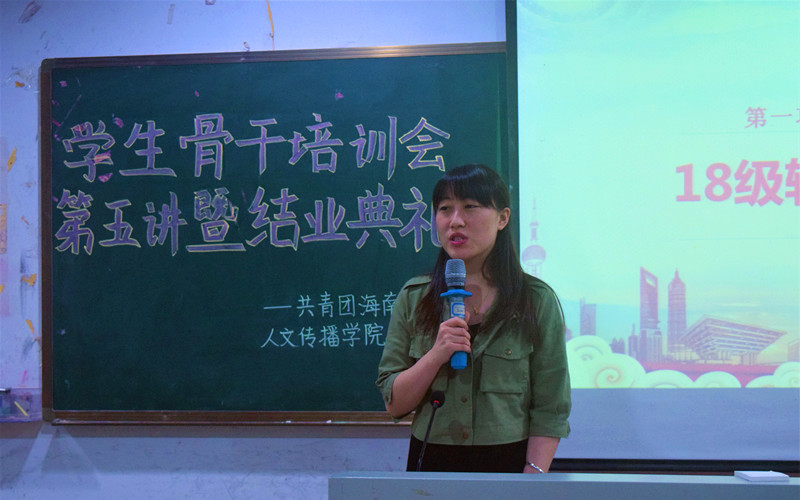 11月25日下午,人文传播公司分团校2018年员工骨干培训班第五讲暨结业典礼在城西校区教学楼2c01教室顺利举行。2018级辅导员王嘉南老师,团委员工副书记秦天、彭丽桦,员工会副主席黄朝恺,青年志愿者协会副会长郑富仁出席结业典礼,结业典礼由秦天同学主持。