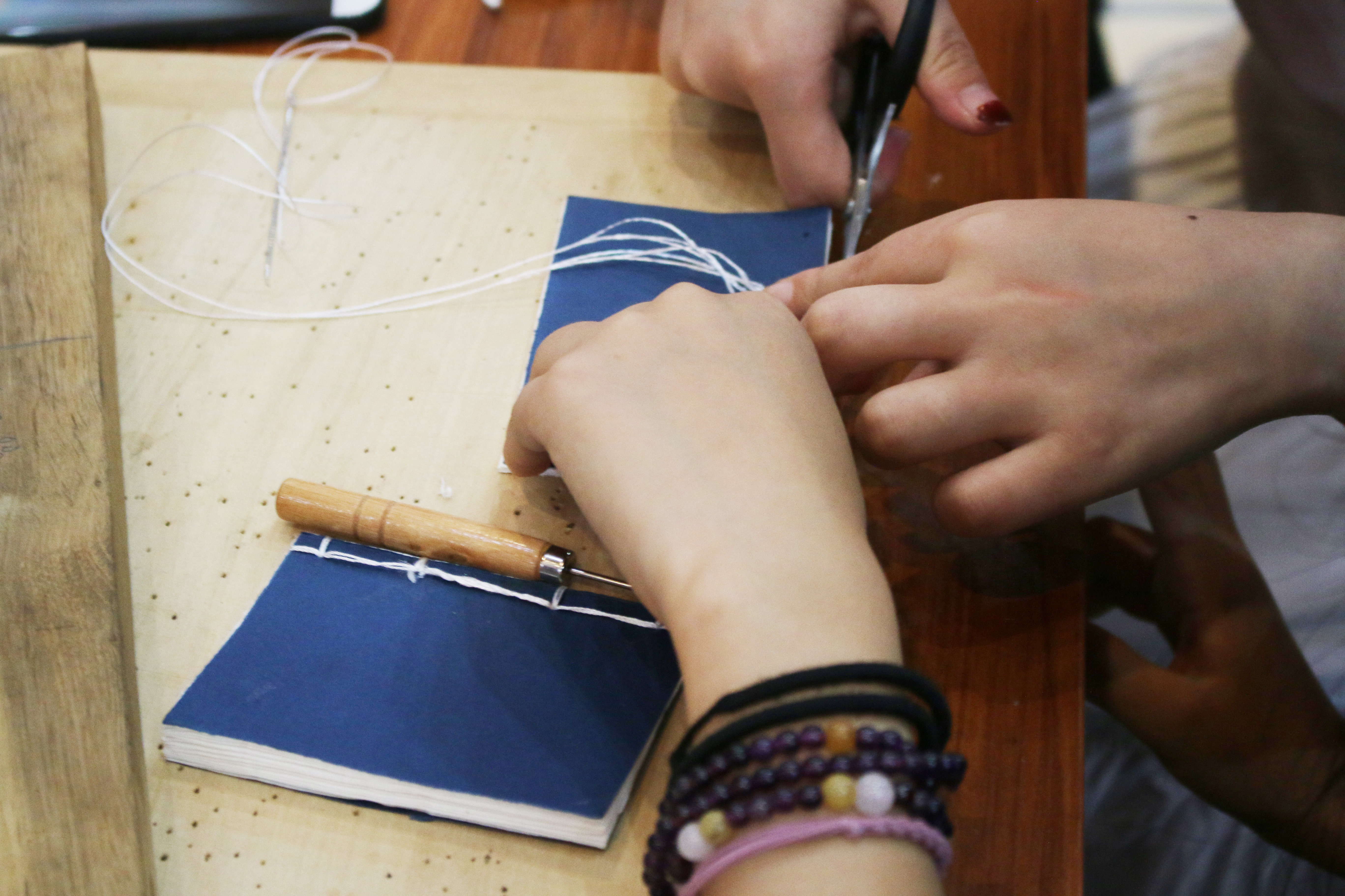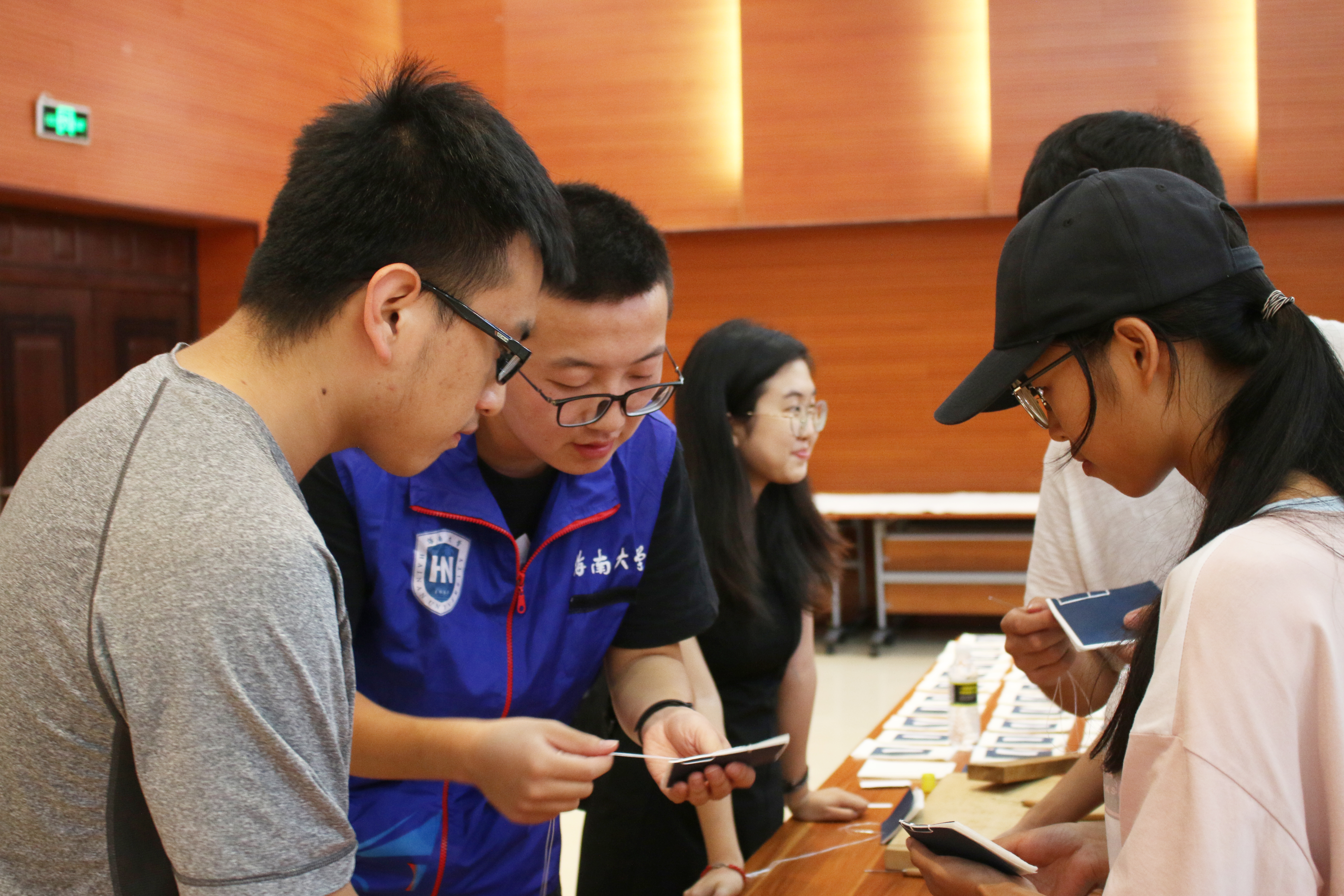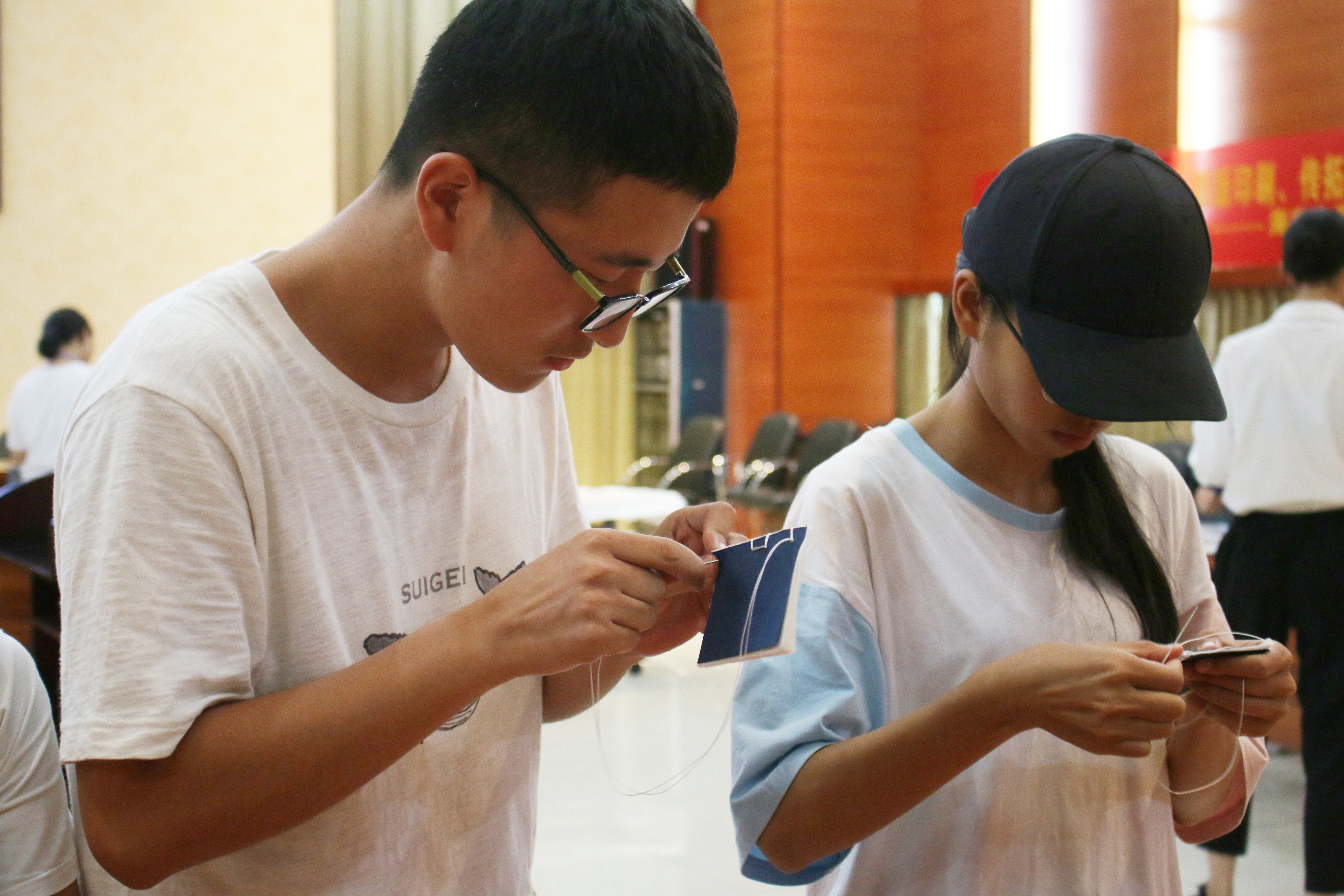 在线装书制作体验区,前来学习线装古籍制作工序的同学们络绎不绝,许多汉语言文学专业的同学表示,“前不久在课堂上学习过的线装书制作过程,今天竟然可以亲身实践体验,真是太幸运啦,以后我要多多关注院内志愿服务活动!”制作一本小型线装书也会耗时较久,同学们与志愿者围在桌边专注地打孔、穿线,一本本精美小巧的线装书在他们手中诞生。
