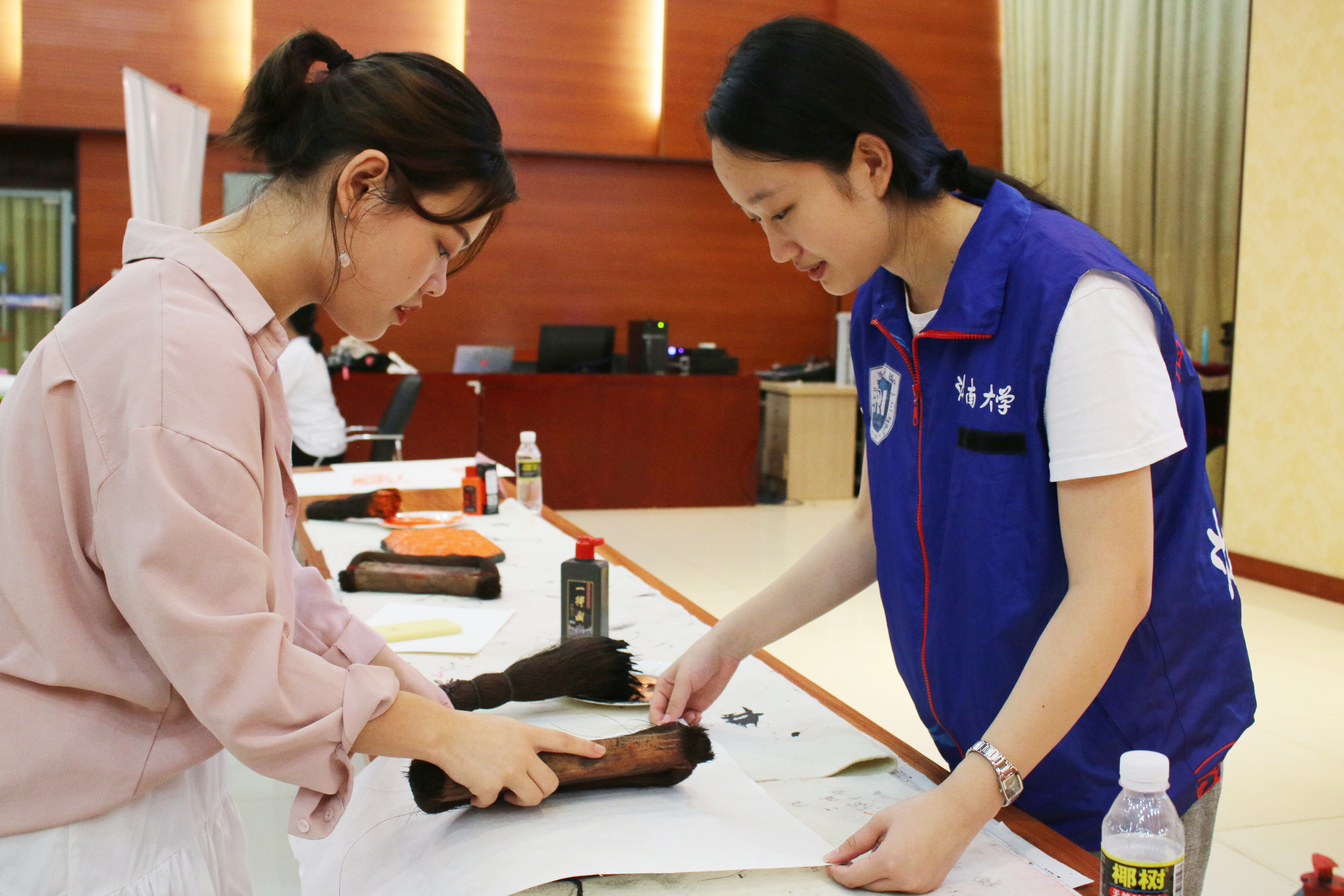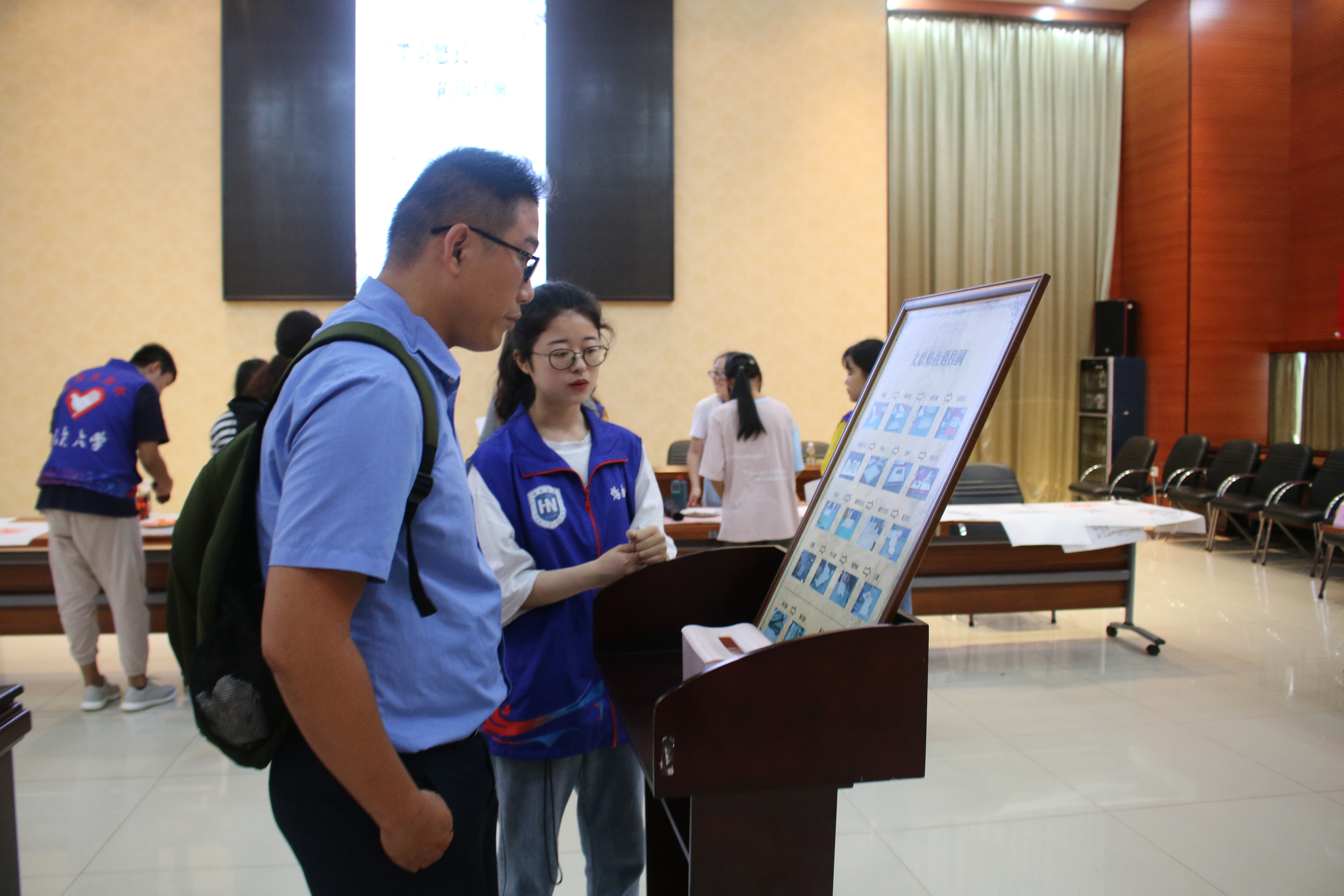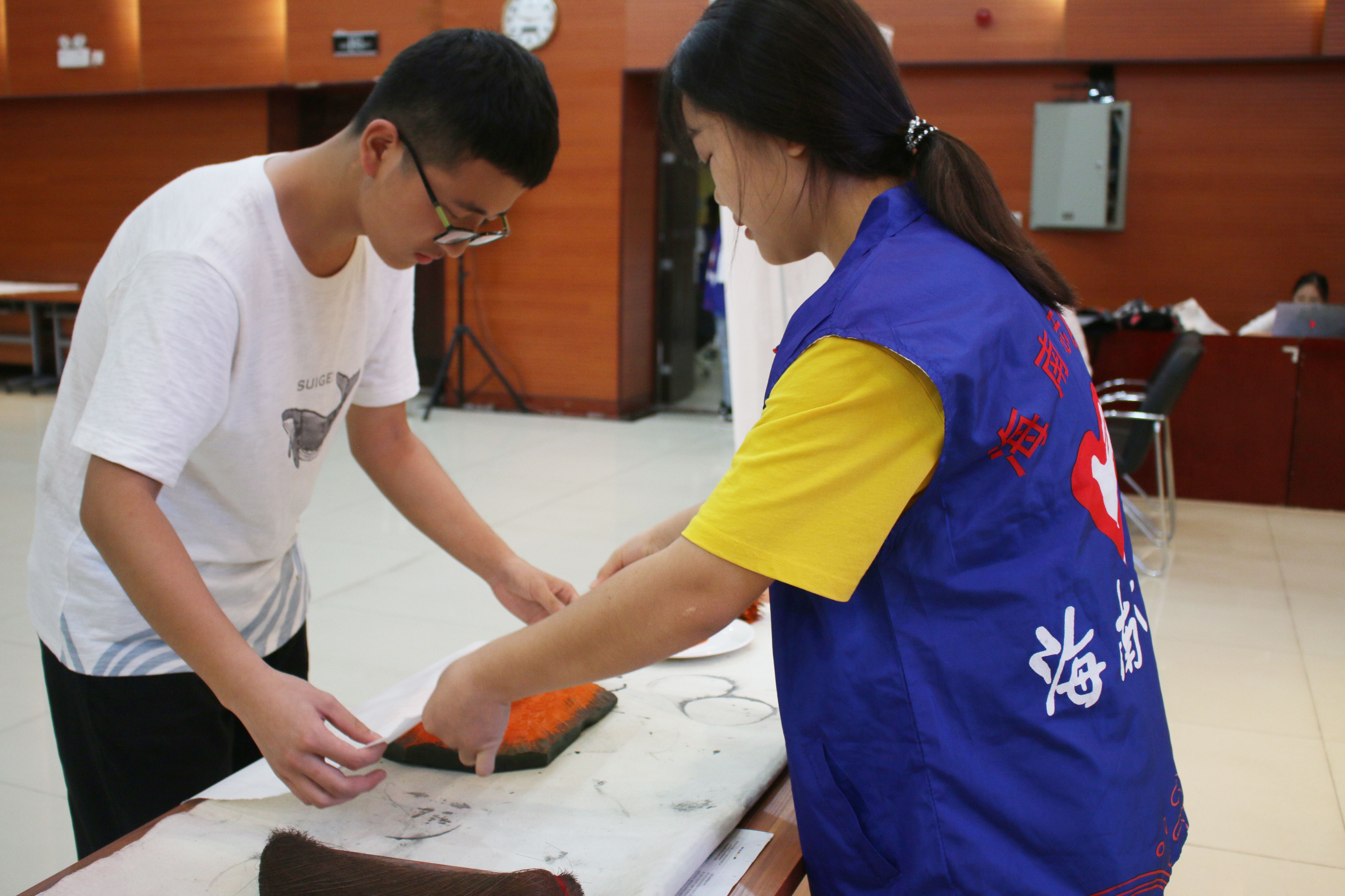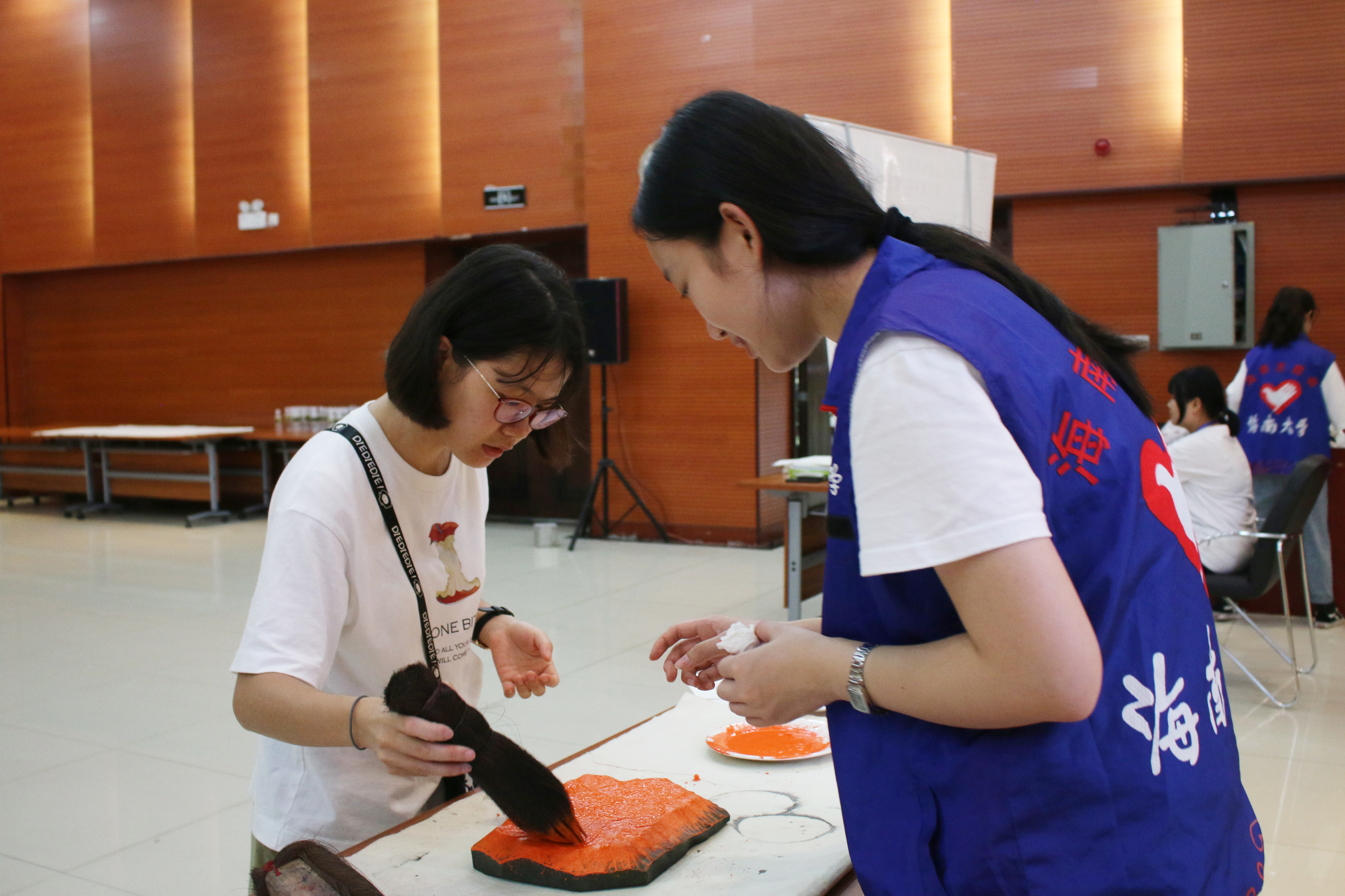 活动开始前,志愿者们与青协工作人员提前到达活动地点布置场地、整理所需工具与材料。由于雕版印刷、水拓画、线装书制作过程中有许多注意事项,为保证活动顺利进行,志愿者们合理分工,提前一周准备活动用纸、熟悉活动流程、学习雕版印刷技艺以及线装书的装订技法,做好前期准备工作以接待前来参观的老师与同学们。