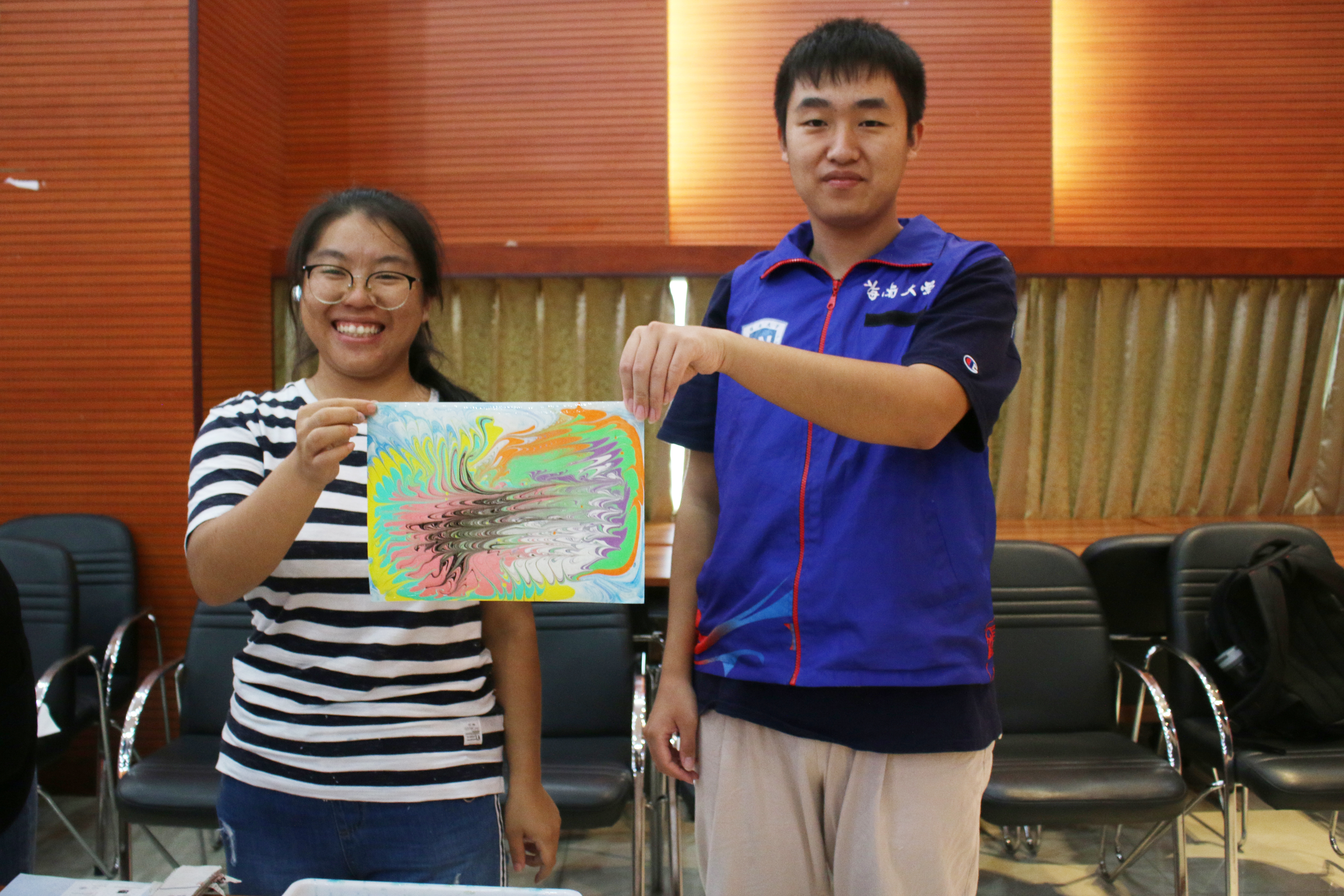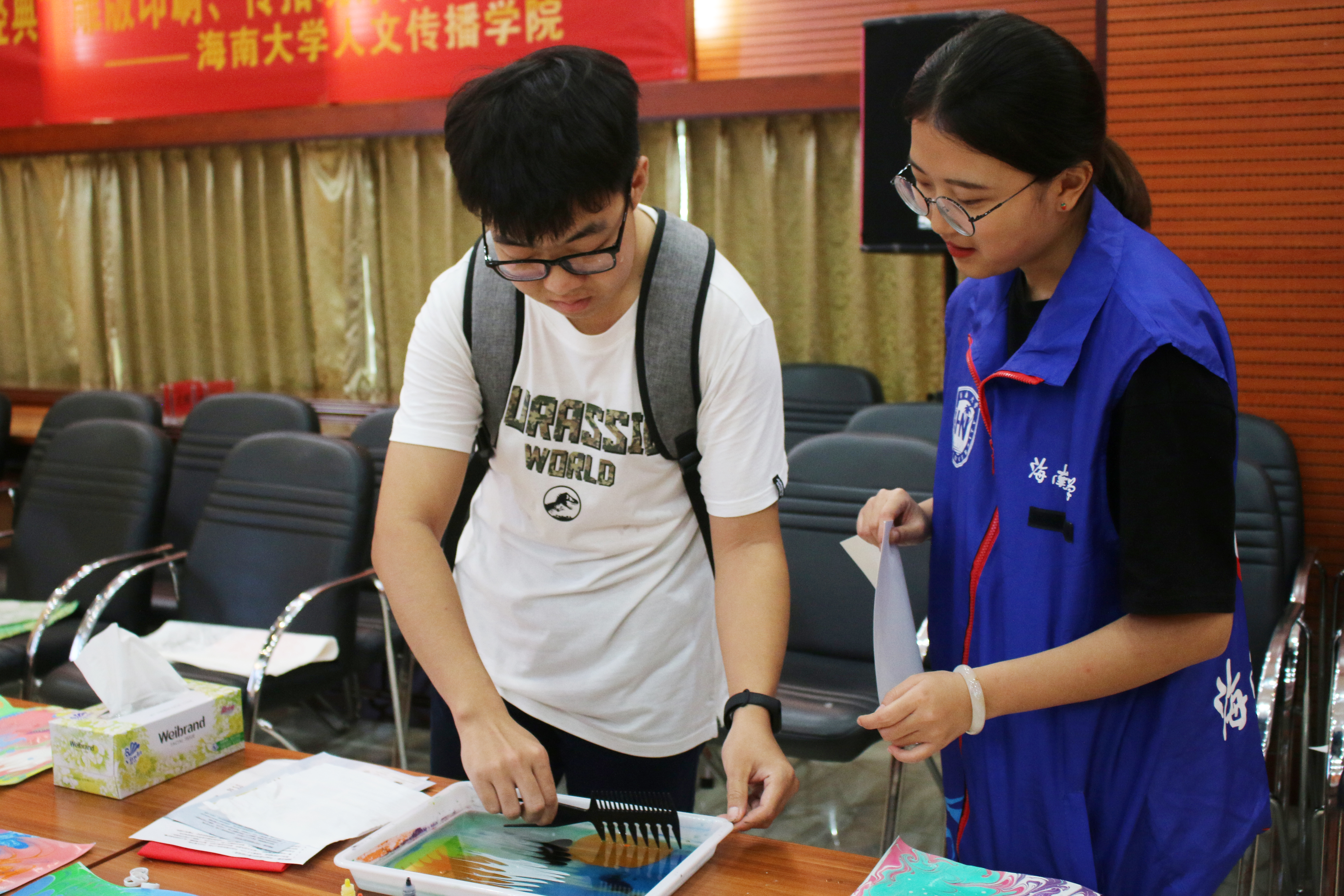在水拓画体验区,用于展览的水拓画成品整齐地摆放在桌上,同学们被美丽的花纹所吸引后跃跃欲试,仔细询问志愿者改如何操作及注意事项。在志愿者的指导下,同学们自由选择各色颜料进行创作,在卡拉胶溶液表面拨出花纹,轻铺纸张于水面,再次拈起时,已变成一幅幅独具匠心的艺术作品。一些同学专注于制作水拓画,称:“希望多做几张风干后带给朋友作为纪念。”
