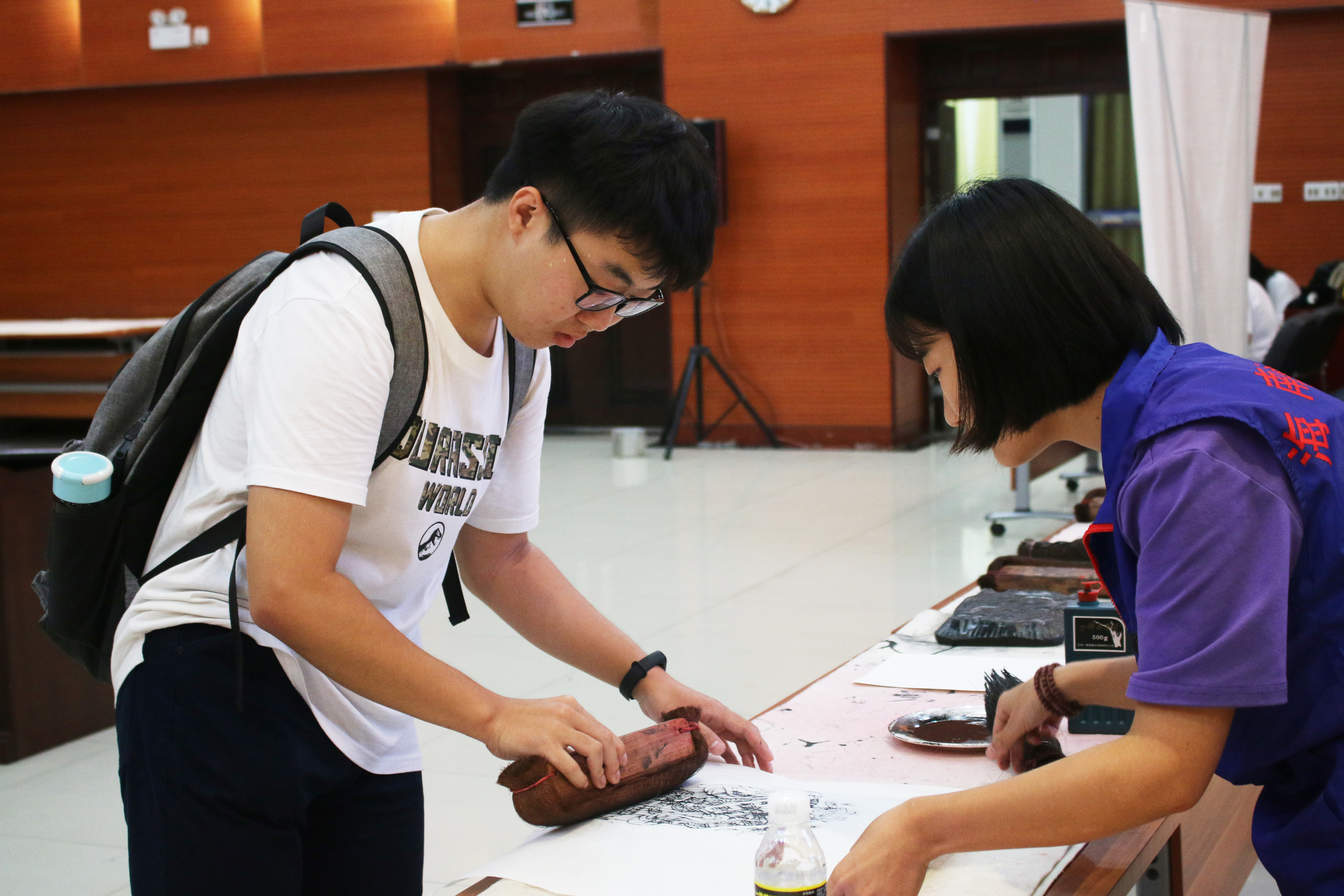 当天活动场地划分为登记区、雕版印刷体验区、水拓画体验区、线装书体验区以及传拓与古籍修复参观区这五个区域,参与者在登记处登记信息便可领取材料进行观摩体验。不少同学体验过后意犹未尽,选择再次排队登记、领取材料,进行第二次体验。活动中,志愿者们耐心地为参与活动的老师、同学们介绍传拓技艺的由来与过程,讲解传拓作品,随后引导其依次体验三种传统技艺。