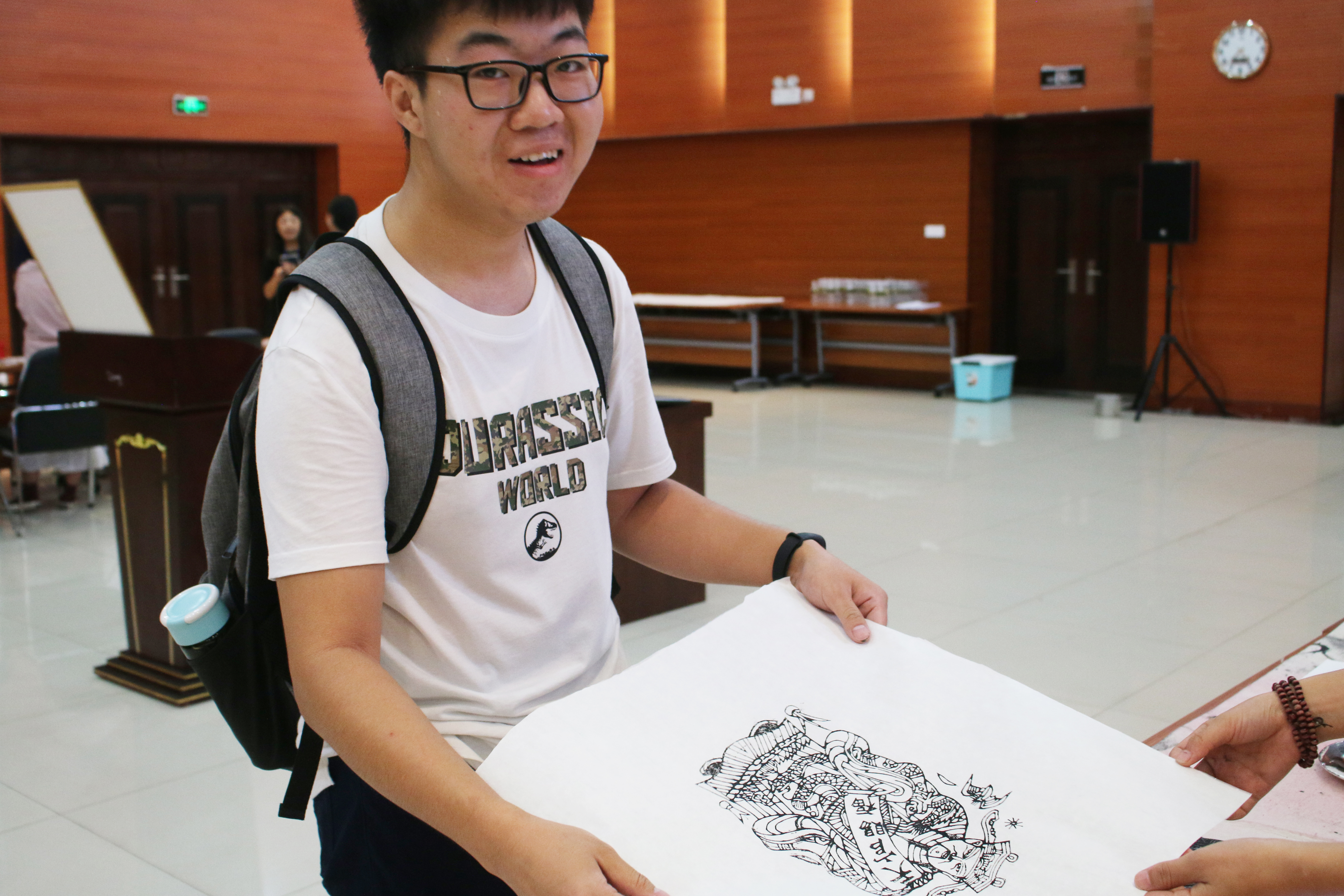 在雕版印刷体验区,经由志愿者和工作人员的演示,同学们可在三块朱仙镇年画雕版任选其一进行印刷,体验雕版印刷技术的精妙之处。由于雕版印刷对技巧和熟练程度要求较高,墨汁的浓淡、刷墨所用时间、鬃刷扫过纸面的时间和力度都会影响作品的质量,不少前来体验的同学都表示这项已被正式列入国家级非物质文化遗产保护名录的技艺的确不容易掌控。在志愿者的鼓励下,同学们多次尝试,掌握方法后都印出了满意的作品。