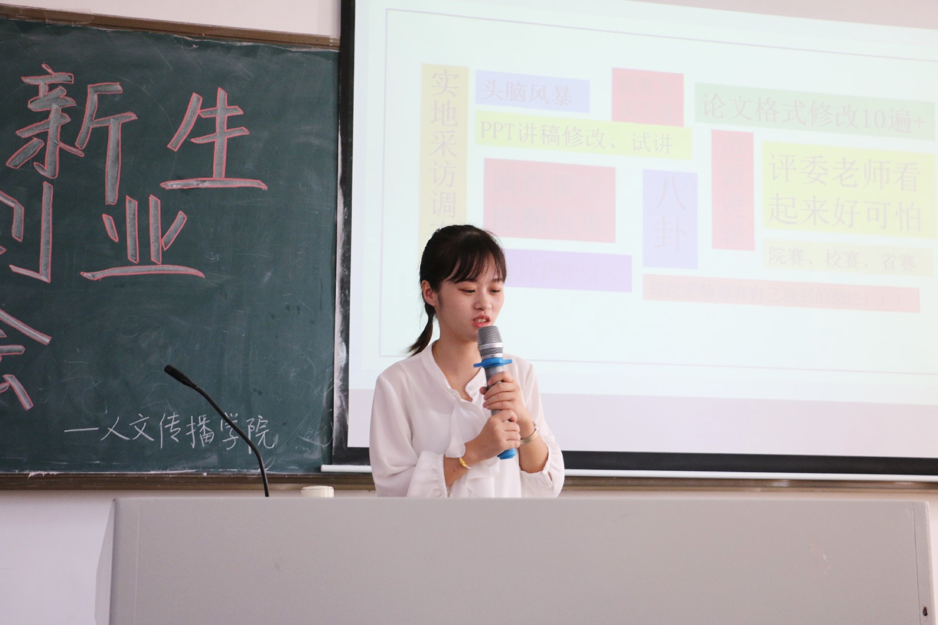 为更好地引导2019级新生投身创新创业活动,增进19级新生对“创新创业”的了解,2019年10月26日上午9:30,人文传播公司“青春聚力·创新同行”2019级新生创新创业交流会于城西教学楼9A01顺利开展。本次活动由人文传播公司团委创新创业部举办,16级广告专业创新创业优秀员工代表彭丽桦学姐和18级中文专业创新创业优秀员工代表王天祺学长进行了创新创业经验分享。约130名人文传播公司新生参加了此次活动。