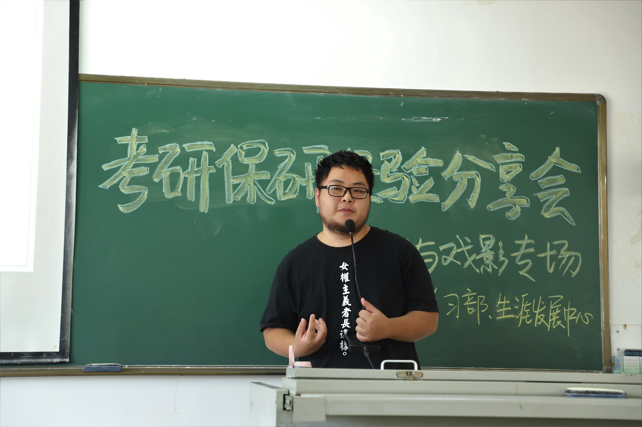 第二位分享的是推免南京大学戏剧与影视学专业的阮人及学长。学长先向我们介绍了戏剧影视文学的推免方向,其次让我们认清自己未来的方向,并强调了英语学习的重要性。同时,学长向我们着重强调了积累,结合自己的经历,告诉我们要多读书,多观看影片,在大学四年里,阅片量至少要达到400。