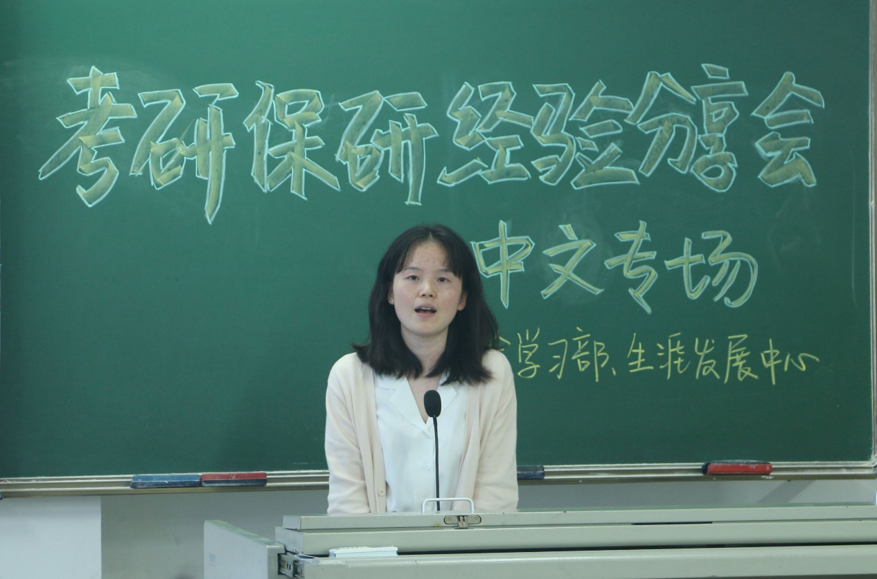 最后一位上台做分享的是推免至北京师范大学汉语国际教育专业的王静静学姐。学姐认为,想要保研成功,充足的准备是必不可少的。有保研意向的同学最好在大三的时候就开始准备材料,要学会自己去找老师写推荐信。学姐强调了思维的重要性,面试的老师最主要是看员工的思维,所以在平时就要去锻炼自己创新,开拓的思维。