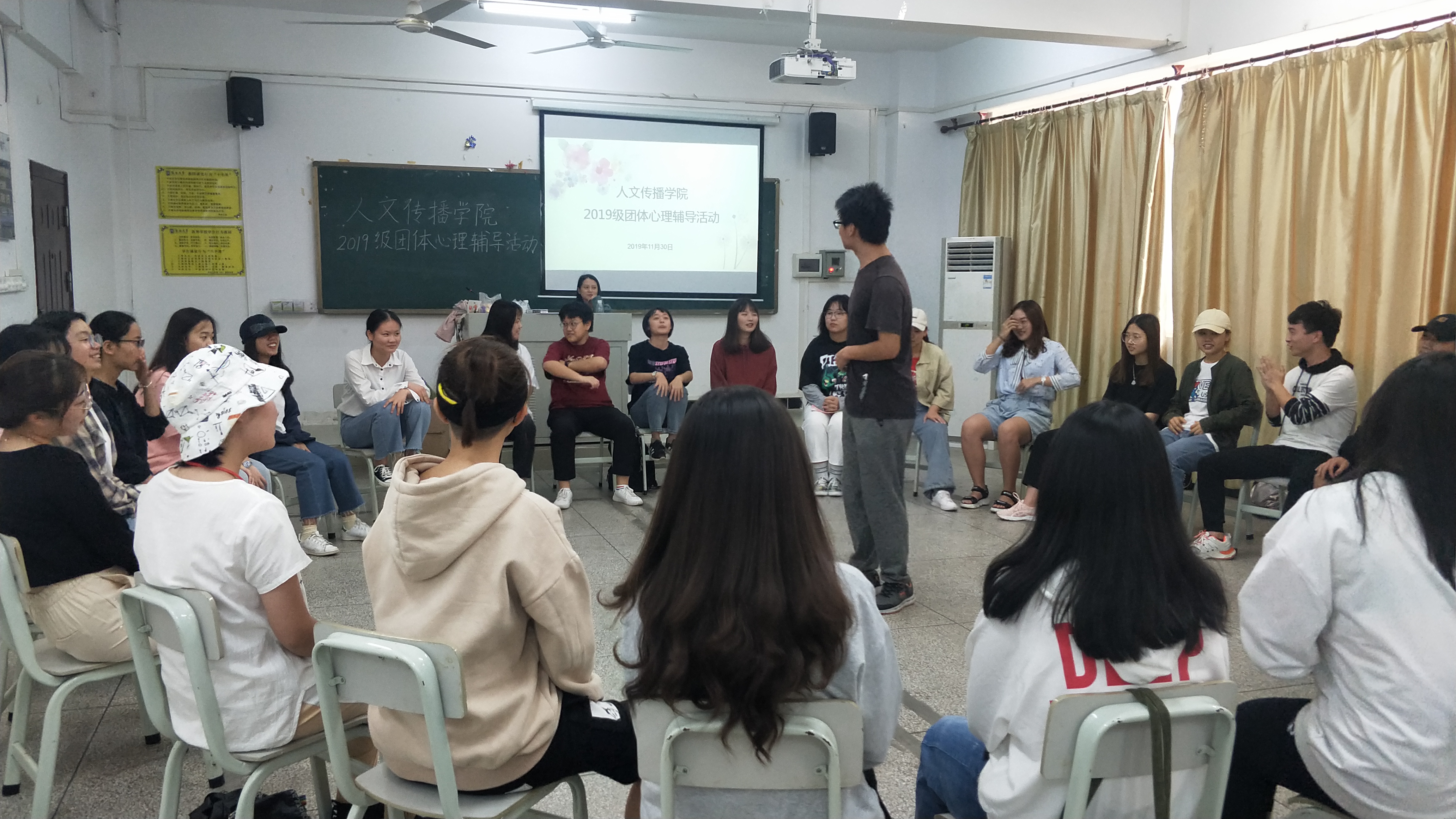 为让大一新生们加强班级熟悉度,让参与者学习人际交往技巧,提高人际交往能力,在团体、社会中更好地与他人沟通交流,11月30日至12月1日,hy3380cc海洋之神人文传播公司2019级新生团体心理辅导活动在城西校区综合教学楼5A05和神农园举行。人文传播公司辅导员李洁和公司心理健康教育中心全体成员组织本次活动,全体新生参与此次团体心理辅导活动。此次活动地点分为室内和室外两个部分,活动环节分为热身环节和正式游戏两个环节。