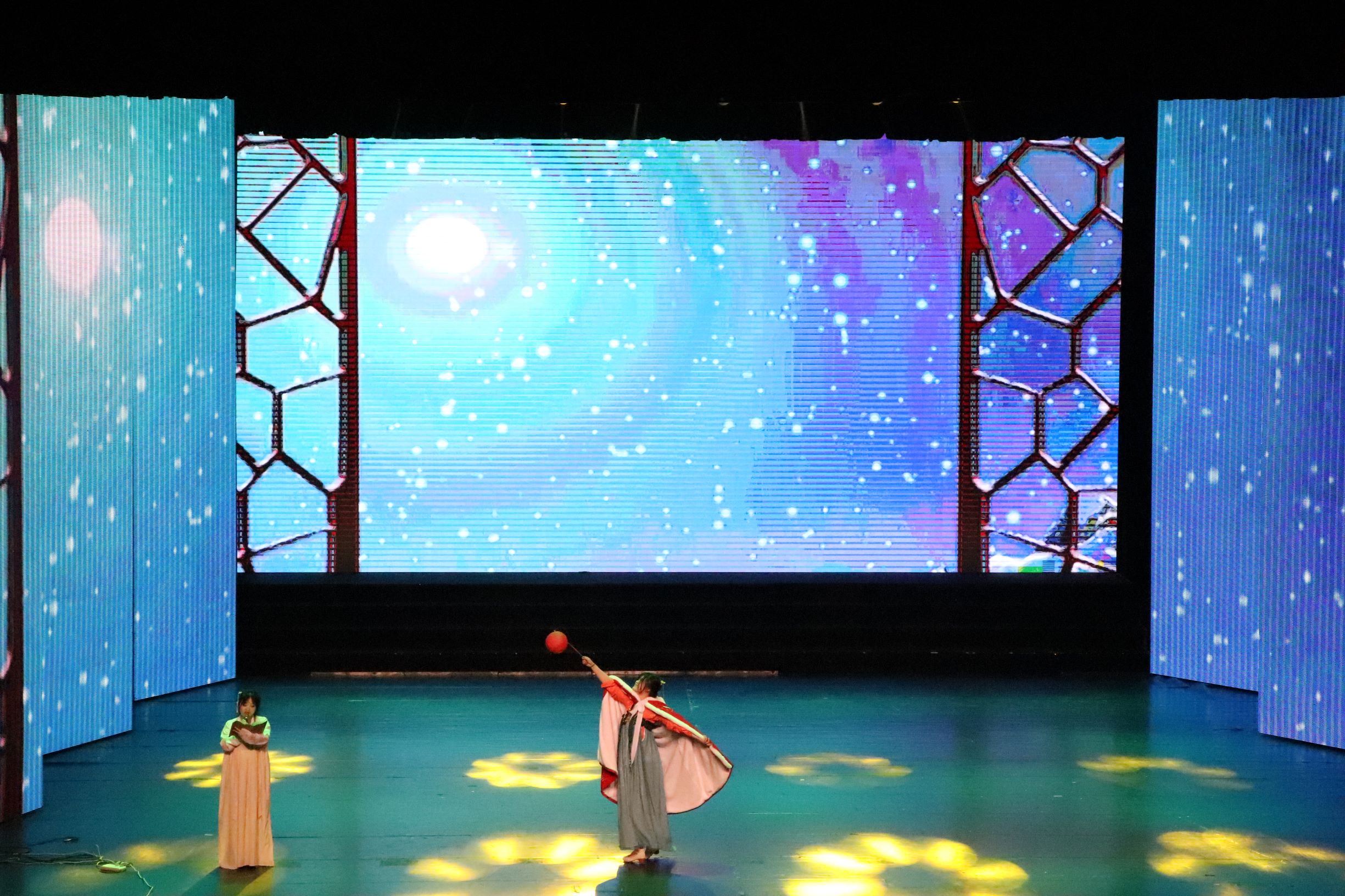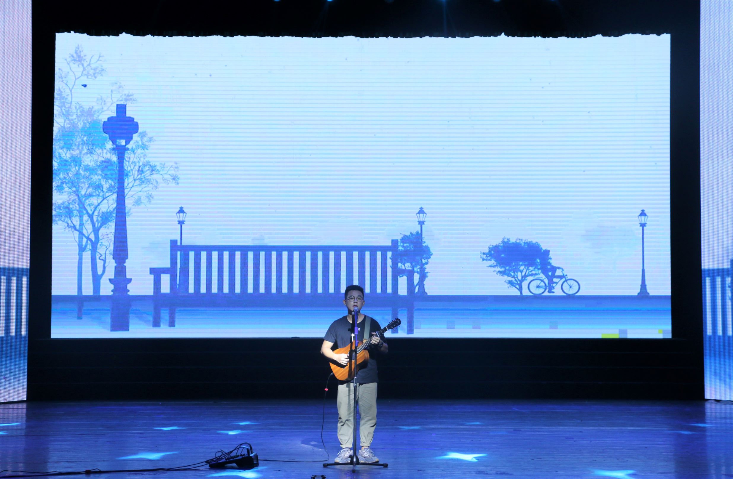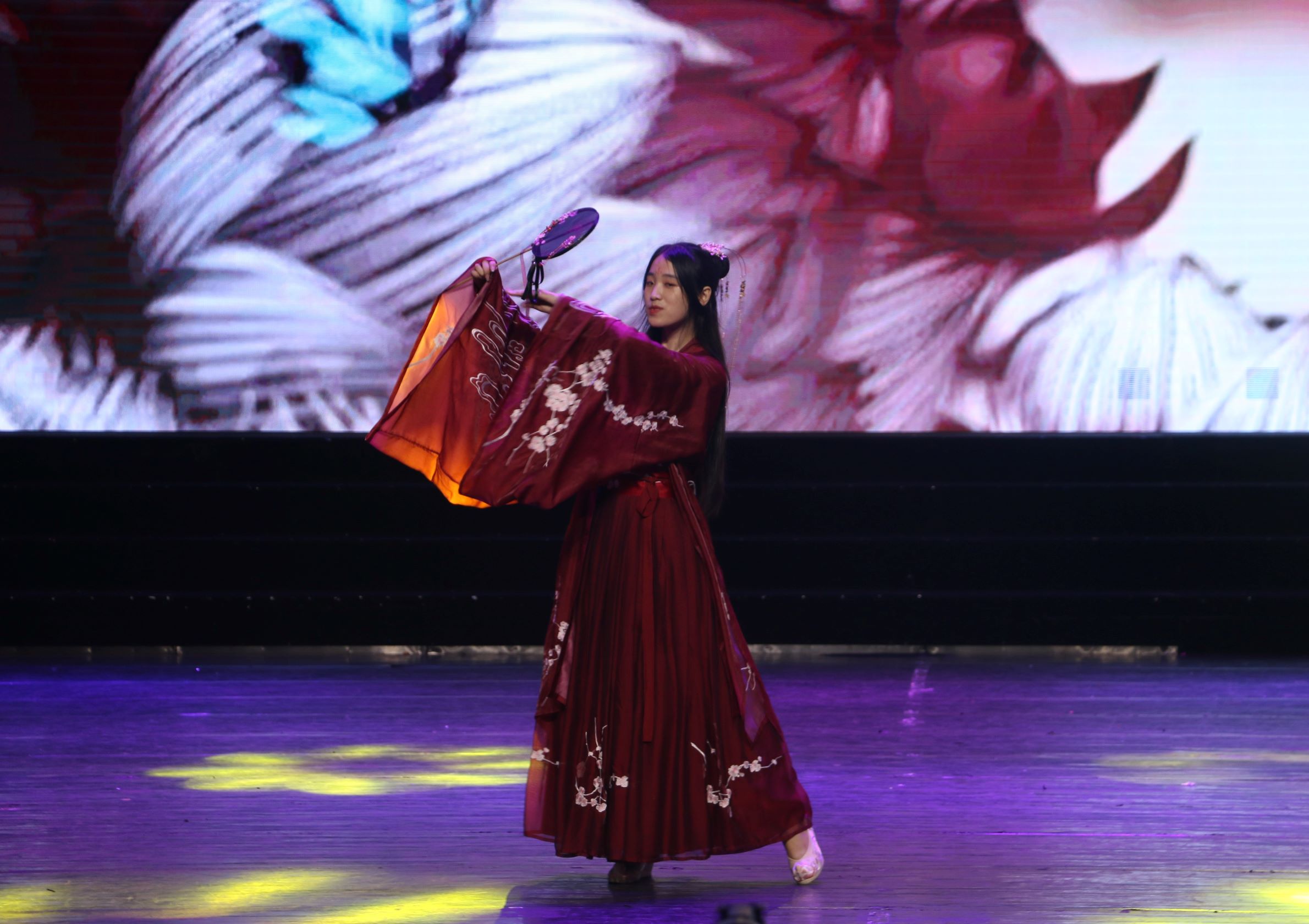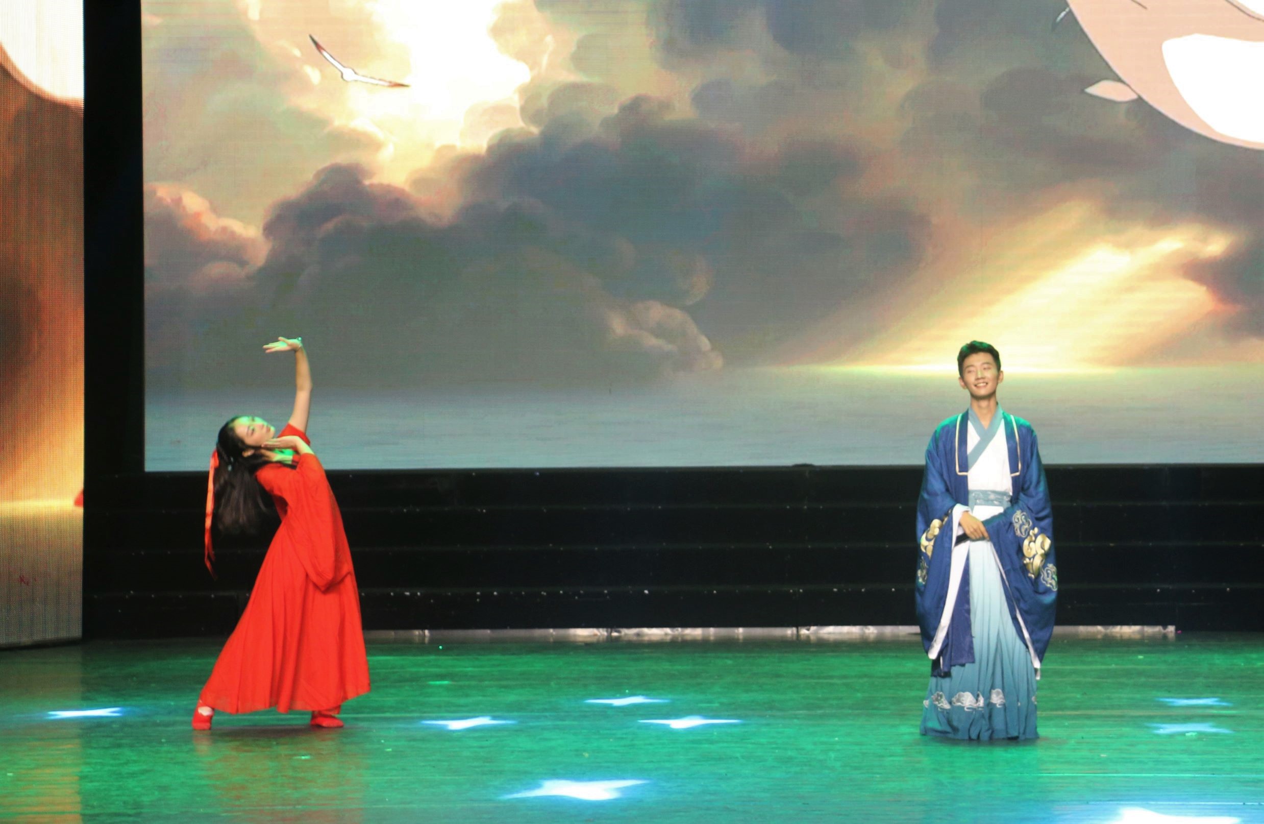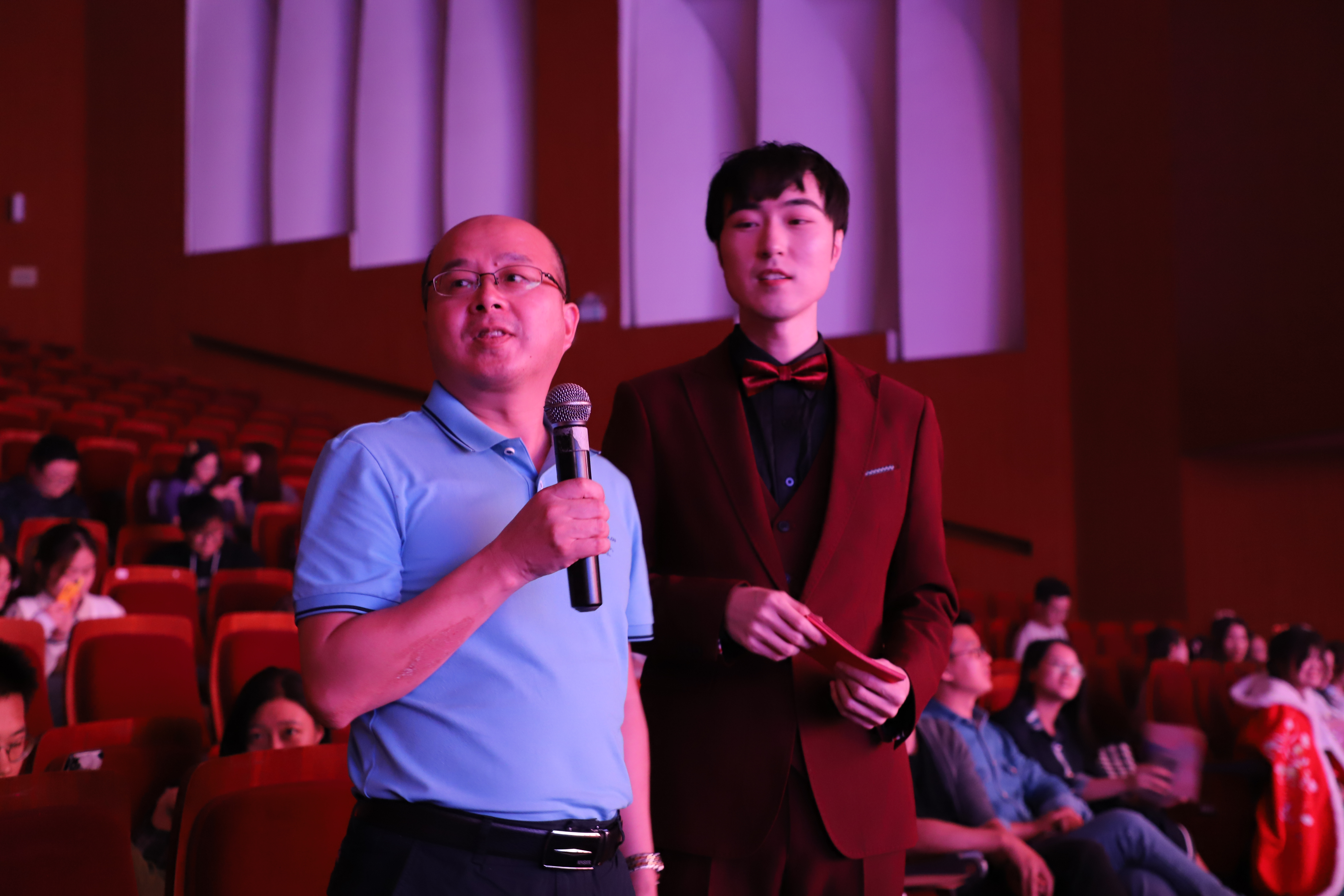 五彩灯下舞动青春,一曲《Adios》拉开了迎新晚会的序幕。开场舞过后,四位主持人上台隆重介绍了出席本次晚会的领导和嘉宾。在同学们热烈的掌声中,全场灯光熄灭,迎新晚会正式开始!演出首先进入第一篇章“云天收夏色”。兰冰洪同学用动人的歌声演绎一首《红玫瑰》,悠扬的旋律谱写着青春的绚烂。随后,符明超同学带来原创吉他演唱《听风吟》,汪宏伟、王景颖带来古风歌舞《大鱼》,这场视觉与听觉的盛宴让观众们赞不绝口、掌声连连。第一篇章结束后,主持人来到观众席进行抽奖环节,观众扫描屏幕上方的二维码参与抽奖,现场气氛十分活跃,最后幸运的获奖者也露出激动喜悦的笑容。