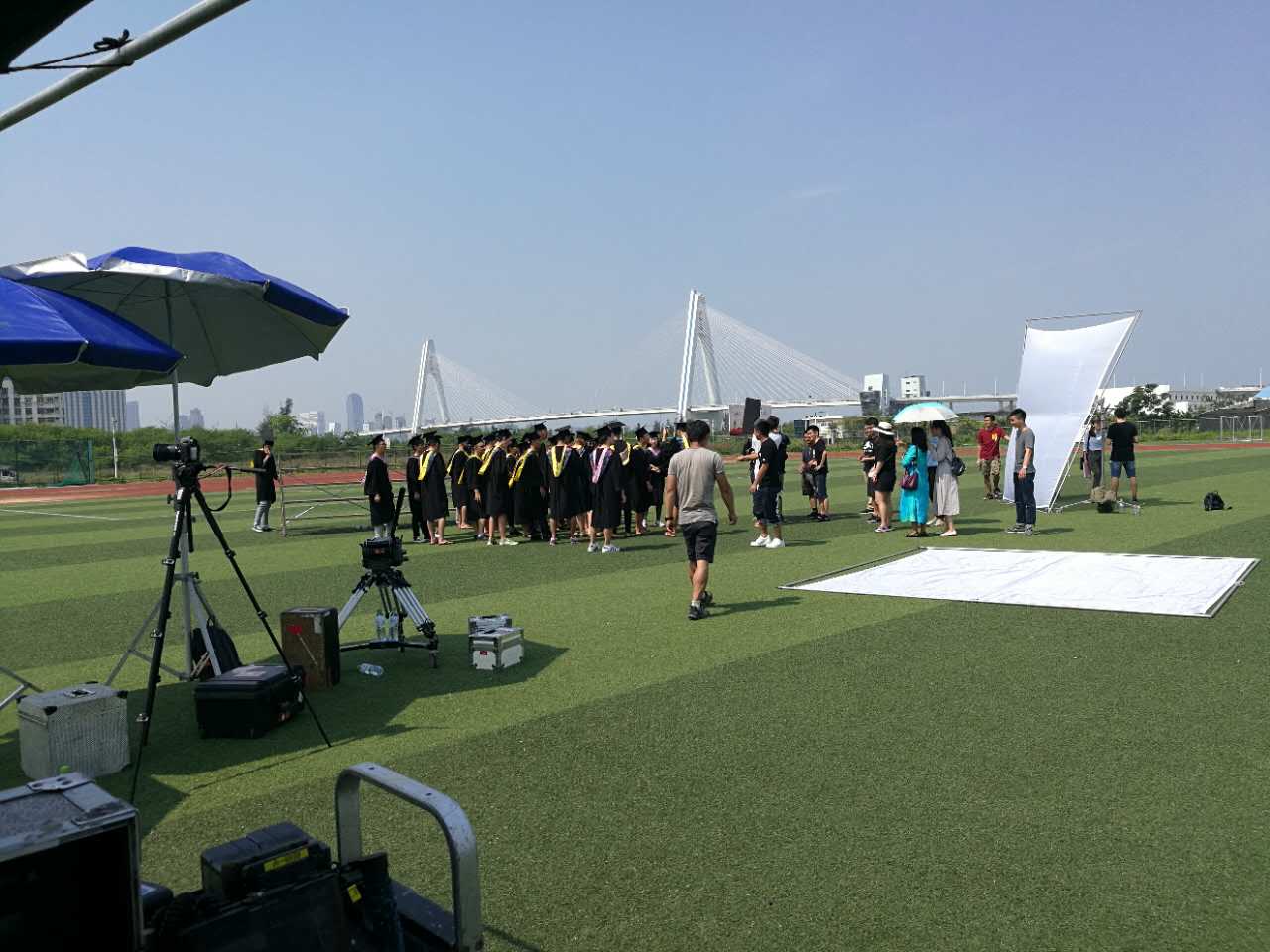 上午9点30分,公司组织的10名员工群众演员与30名外籍职工身穿学士服、头戴学士帽,在第二田径场助力此次拍摄活动。拍摄现场,更不少公司员工主动参与场务帮忙,并与李恒君导演深入交谈。上午的场景拍摄,重在表现中国先进的教育体系会和“一带一路”沿途各国一起分享,展现中国员工和外国同学其乐融融友好的关系。据悉,本次宣传片名为《我们的诗》,五月份将在央视播出。