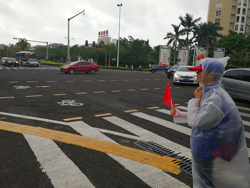 9月14日,台风来临,志愿者仍坚持工作。督导过程中,志愿者们协助交警引导行人按秩序过马路,制止那些想闯红灯的行人,并向他们宣传文明行路等交通法规。虽然天气情况恶劣和高峰期的路口车辆拥堵、行人众多,但志愿者们不怕苦、不怕累,坚守岗位,认真工作,很好地完成了文明交通志愿者的岗位职责,他们面带微笑地劝阻和教育违章者,提醒路人遵守交通规则,行人们都有序地排着队等候绿灯,道路上行驶的车辆也秩序井然,令过往行人不由得驻足观望,交口称赞。