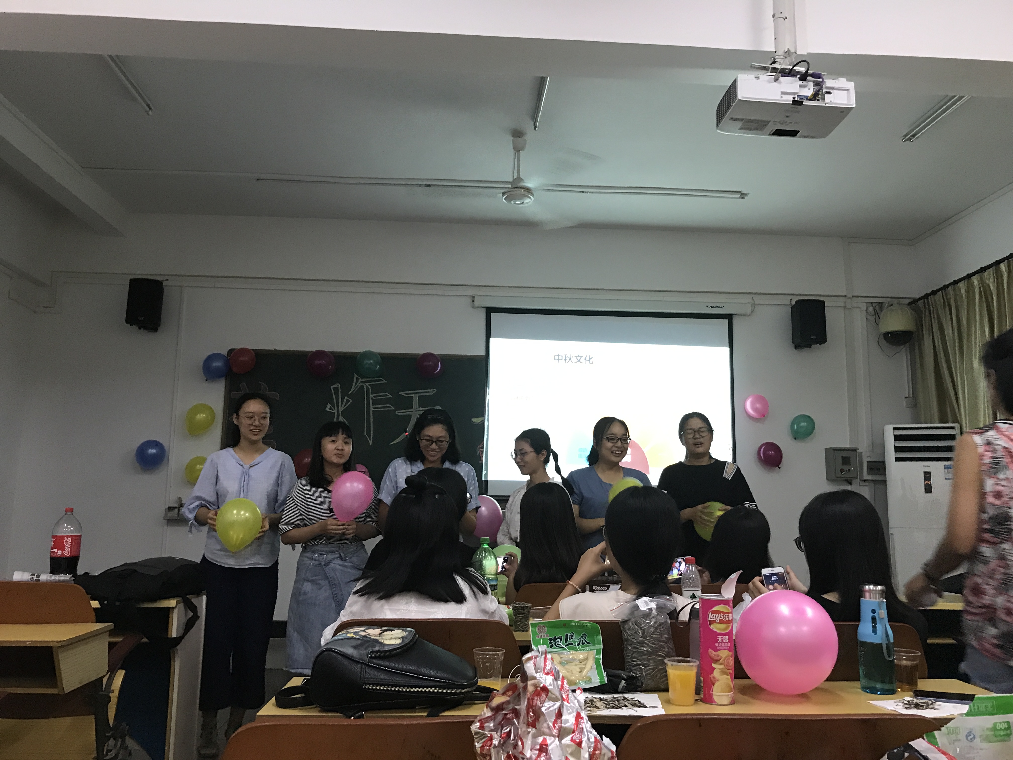 各班级分别进行了精彩激烈的游戏环节。红歌接龙、真心话大冒险、谁是卧底、舞蹈表演等小游戏依次展开,欢乐不断。其中,17级戏剧影视文学1班更是玩起以“月”、“中秋”等为关键字眼的诗词飞花令,更增添了一丝中秋佳节的味道,展现了传统文化的美好。各班班委细心准备,还为同学们精心准备了美味的零食、寓意团圆的月饼、新鲜可口的水果。同学们也踊跃上台展示才艺,将本次茶话会推向一个又一个高潮,茶话会在笑声、掌声、欢呼声的氛围中陆续圆满结束。
