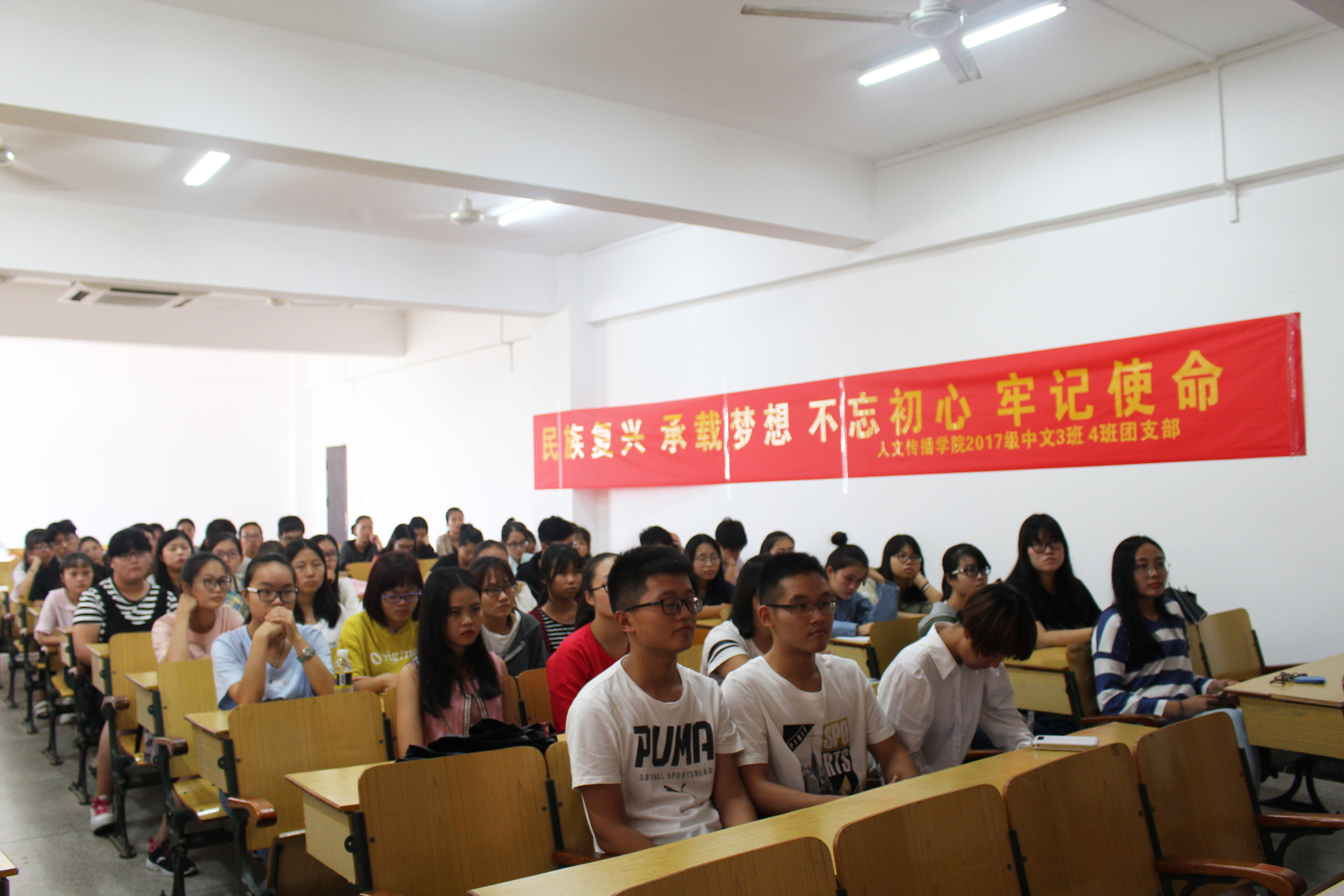 10月31日下午,为学习宣传党的十九大精神,人文传播公司中文3班、4班团支部,在城西校区教学楼9A01教室联合组织学习了党的十九大精神,会议由中文4班宣传委员丁雪妍和中文3班心理委员林可平主持。