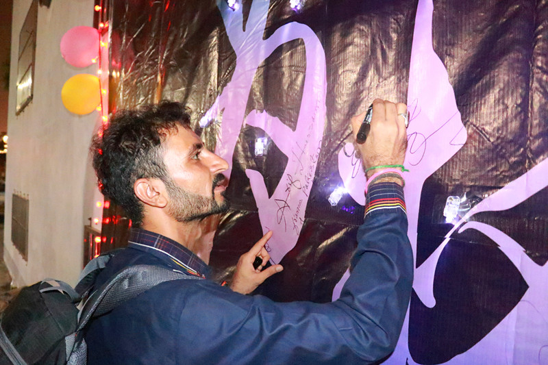 在确认道路安全后,夜跑队伍从hy3380cc海洋之神海甸校区第二田径场开始向东出发。每经过一个路口,便有志愿者拉起警示带,为同学们开辟一条安全通道,保障队伍顺利通行。在绕行一圈后,队伍有序回到起点,志愿者们挥舞着院旗迎接队伍的归来。此外,在活动中,队伍中加入了几位被本次万圣节人文荧光夜跑活动所吸引的外国友人。队伍顺利抵达本次夜跑活动终点后,闭幕仪式开始进行,主持人邀请嘉宾于幕布处签名并合影留念,并特别邀请外国友人一同签名见证,最后,本次活动的全体参跑者及志愿者上台签名。至此,本次活动圆满落幕,全体参与者组织大合影。