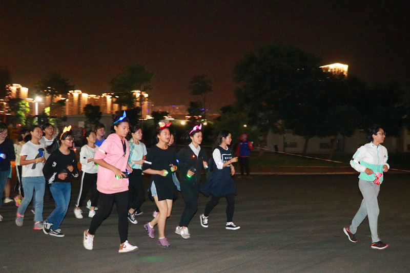 在经过一下午紧锣密鼓的准备后,参跑同学陆续入场签到,并领取荧光、发卡等万圣节饰品。19:30,活动准时开始,在轻松欢快的音乐中,主持人孙靖媛、楚杨炫上场介绍了到场嘉宾及接下来的活动安排。紧接着,文工团给在场观众带来激情四射的热舞《worse it》、《play the fire》,动感的舞步将全场气氛推向了一个小高潮,全程掌声四起,喝彩不断,大家已热血沸腾,跃跃欲试。随后,体育部副部长王翌晨上场带领大家排好队型,进行热身准备活动。
