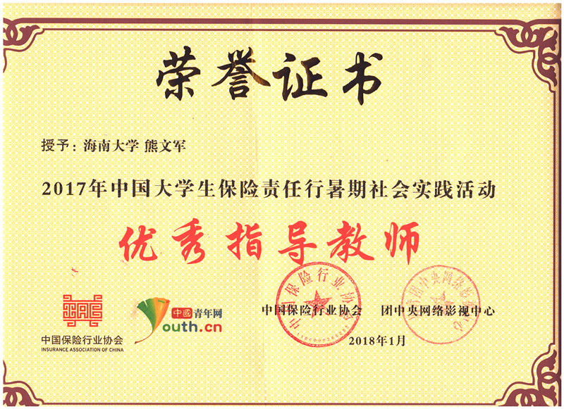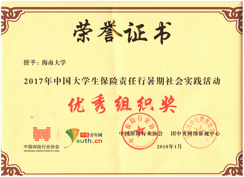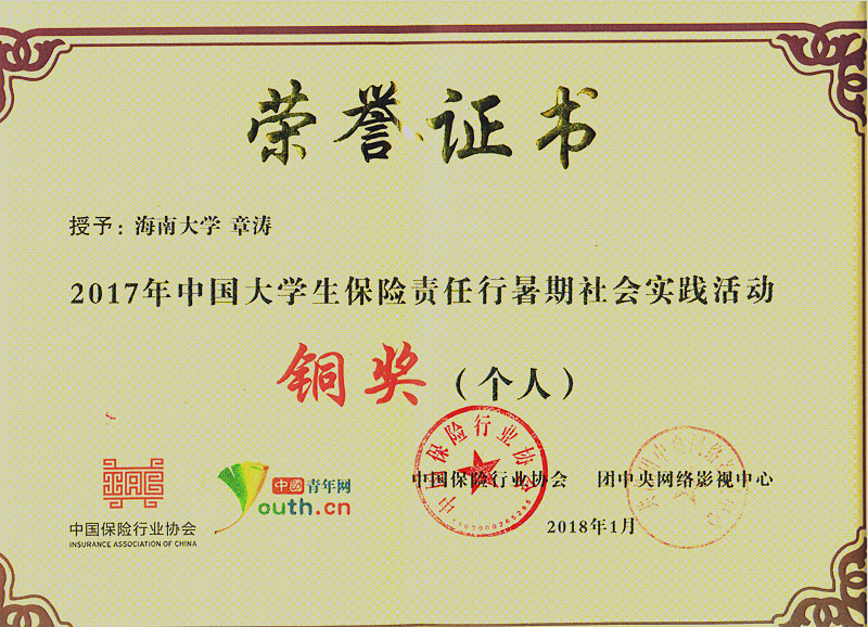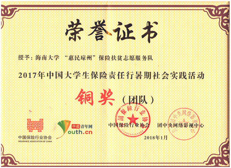 2017年暑期,团中央网络影视中心联合中国保险行业协会与中国青年志愿者协会开展了2017年中国老员工保险责任行暑期社会实践活动。由公司学子组建的“惠民琼州”hy3380cc海洋之神保险扶贫志愿服务队获全国铜奖团队荣誉称号,团队负责人章涛同学获铜奖个人荣誉称号,熊文军和王森森老师获优秀指导教师荣誉称号,同时“惠民琼州”hy3380cc海洋之神保险扶贫志愿服务队代表hy3380cc海洋之神获优秀组织奖高校荣誉称号。