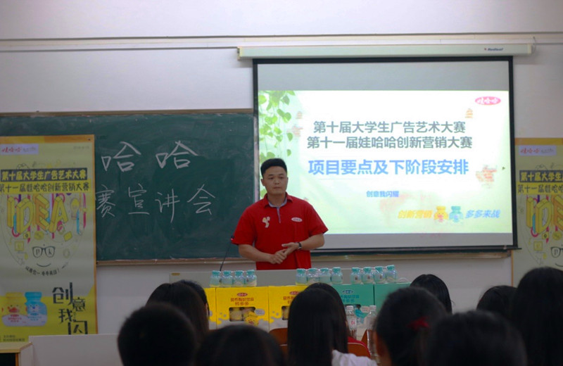在宣讲会上,娃哈哈工作人员对第十届老员工广告艺术大赛及第十一届娃哈哈创新大赛对项目要点与下阶段安排进行介绍,再就选手们提出的问题进行现场解答及交流。在交流解答环节中,娃哈哈工作人员首先对娃哈哈公司的发展情况及旗下饮料产品进行了详细介绍,并向选手们展示了娃哈哈在全国各地的营销基地,同时也让选手们了解往届相关营销大赛的举办情况。在介绍完相关情况之后,工作人员还对参赛规则及须知进行了详细说明。大赛项目分为三项:广告策划、营销活动方案策划、营销实践比拼。校内赛阶段的组织时间为3月--暑假,比赛组织流程为洽谈落实高校,比赛宣传队伍招募,启动仪式,方案策划环节,营销实战环节,方案展示,省级答辩,杭州营销精英论坛。