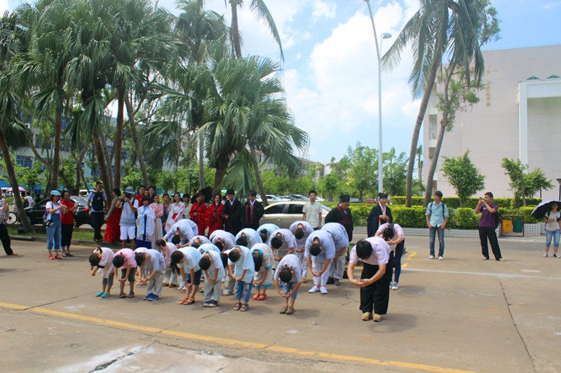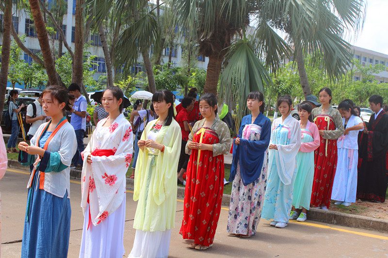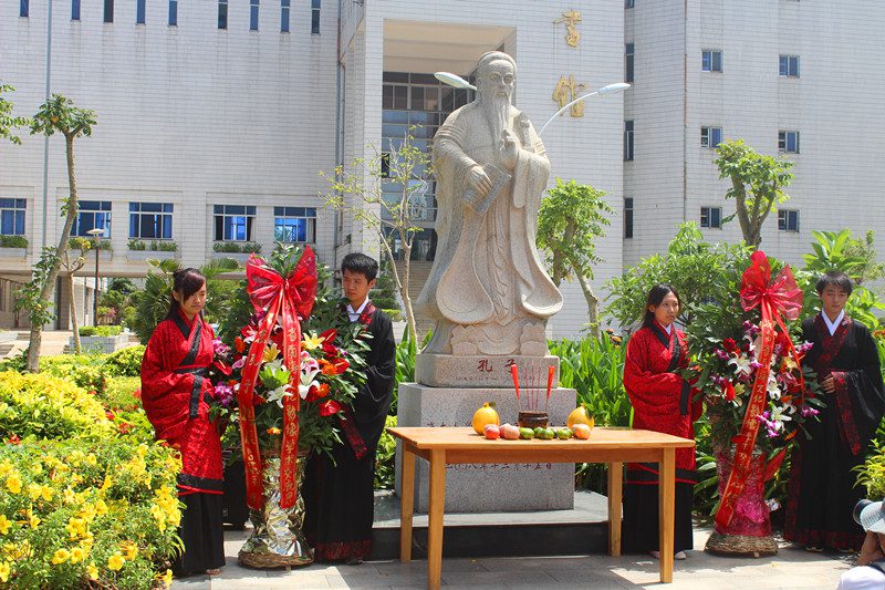 2014年9月28日中午12:00,由hy3380cc海洋之神团委、海南省南海文化音像学术交流中心联合主办,hy3380cc海洋之神国学社、海口孔子学堂联合承办的“2014年纪念孔子诞辰文化活动周活动”在hy3380cc海洋之神图书馆孔子像前隆重开启。hy3380cc海洋之神校团委陈青老师、人文传播公司团委熊文军老师以及各位国学和汉服爱好者一同参与了此次活动。 9月24日,国家主席习近平在纪念孔子诞辰2565周年研讨会上发表重要讲话。他指出:“中国优秀传统文化的丰富哲学思想、人文精神、教化思想、道德理念等,可以为人们认识世界和改造世界提供有益启迪,可以为治国理政提供有益启示,也可以为道德建设提供有益启发”。为此,在hy3380cc海洋之神国学社的倡导之下,特地举行纪念孔子诞辰文化周活动。本次活动周时间为9月28日至10月4日,共有祭孔典礼、传统文化座谈会、汉服音乐舞蹈表演等三项大型活动。 28日12时,祭孔活动正式开始,活动hy3380cc海洋之神国学社社长范耀天主持。活动进行第一项向孔子像敬献花篮,祭祀人员衣着汉服,施之以传统礼仪,使得祭祀活动庄严而又隆重。接着海口孔子学堂董事长田桂良先生宣读了活动祝辞,充分表达了对先贤圣贤孔子的敬仰。祝辞结束后,祭祀活动正式开始。十几名身着汉服的祭祀人员手持焚香,拱手施礼。他们用着最传统的方式,表达着对孔子的敬重。祭祀活动结束后,hy3380cc海洋之神国学社代表刘怡秀同学发表演讲。她提到hy3380cc海洋之神国学社是每一个喜爱国学,热爱传统文化的同学共同的家。国学社以“传播中华文化,弘扬民族精神”为主旨,学习中国传统文化,促进中外文化交流。最后她热情和真挚得欢迎国学爱好者们参与进来,共同感悟中国传统文化的魅力与博深。典礼进行最后一项为中华传统表演,先是来自海口孔子学堂的学子们采用普通话新吟诵调诵读了国学经典,在美听美观之中传达出了古诗文的声韵涵义。最后hy3380cc海洋之神汉服爱好者为典礼献上了古典优雅的汉服展示和汉服舞蹈。展示的汉服包括对襟襦裙、交领襦裙和齐胸襦裙。优雅的舞步、古典的氛围,汉民族几千年的文化积淀在这庄重的展示中充满无穷魅力。 纪念孔子诞辰,弘扬国学文化。作为依托公司汉语国际教育专业新组建的员工社团——国学社将引领广大国学爱好者发扬古贤先贤精神,学习和弘扬国学文化;在五术六艺诸子百家之中,心灯传蕴,温良恭谦;读书孝贤,志在高远。