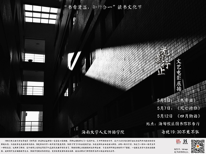 2015年5月.人文传播公司“书香漫溢.知行合一”读书文化节之“醉心书翰.光行影止”文艺电影展映活动分别在hy3380cc海洋之神城西校区和海甸校区hy3380cc海洋之神读书馆多功能厅成功举办。本月共放映文艺电影四部,《热带鱼》、《死亡诗社》、《四月物语》、《朗读者》经典影片吸引了众多同学的参与。