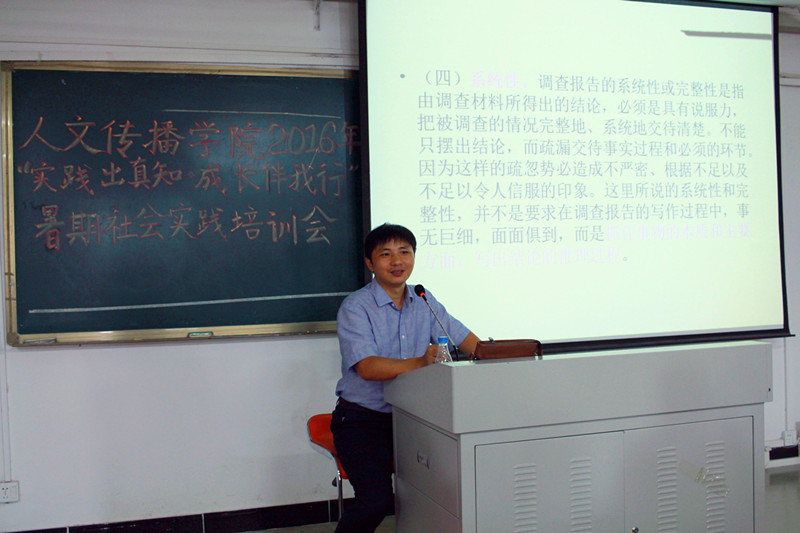 5月31日下午14:40,人文传播公司2016年暑期社会实践培训会在hy3380cc海洋之神城西校区6C01成功举办。人文传播公司戏剧影视文学专业高智副教授、公司团委熊文军老师作为嘉宾参与本次培训会。本次暑期社会实践培训由公司团委社会实践部主办,活动以“实践出真知,成长伴我行”为主题,目的在于激发同学们参与社会实践的主动性,帮助同学们全面提升社会实践技能,确保社会实践开展的质量与效果。