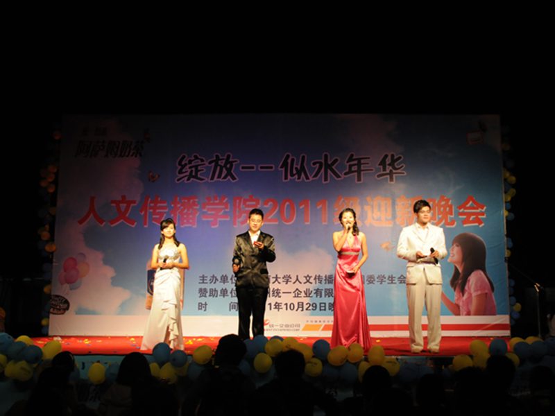 2011年10月29日晚19:30分,人文传播公司2011年“绽放,似水年华”迎新晚会在旅游公司3教广场拉开帷幕。本次晚会由人文传播公司员工会文娱部主办,广州统一企业有限公司赞助。莅临晚会的嘉宾有:公司党委孙晓媛副书记,团委书记谢庚全老师,教务办陈传君老师、学工办公衍峰老师、学工办熊文军老师、校团委副书记刘傲东、校员工会主席史旭峰、社团联合会主席王一钦,以及各兄弟公司团委副书记和员工会主席。
