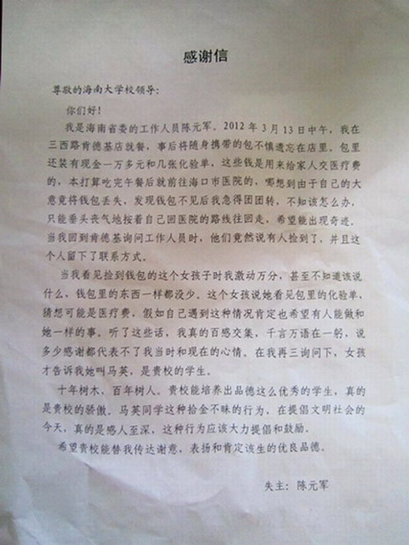3月16日,一面写有“百年育人、拾金不昧”的锦旗和一封感谢信被送往人文传播公司学工办,映着初春明媚的阳光,锦旗上几个金黄的大字着实闪耀。 经了解,拾金不昧的同学正是公司2008级对外汉语专业的马英同学。随后,公司与该同学取得联系,终于了解了事情的全部过程。13日中午,马英同学正在三西路肯德基吃午餐,坐在她对面的先生吃完东西,没有拿上随身的包便离开了。起初马英同学并没在意,以为那位先生只是暂时离开,不想直到她吃完了午餐也没见那位先生再回到座位,包还一直放在那里。马英同学随即猜想,是不是那位先生已经离开了餐厅,把包落在了那里。于是她立刻联系餐厅服务员,试图从监控录像中找到失主,但尽管有录像,失主离开餐厅后的去向也不得而知。 马英同学想等失主回到肯德基来寻找自己的包,又想自己想办法尽快找到失主。便把自己的电话留给肯德基的负责人,之后带着失主的包回到公司。回到宿舍后,马英同学打开失主的包,想要找到一些有关失主的信息,不曾想映入眼帘的竟是一万多元的现金,还有就是几张化验单。她心想这很可能是人家的医疗费,更是替失主担心起来。 恰好此时失主通过肯德基的工作人员联系到了马英同学,两人通过电话联系,约定了地点,马英同学便急忙把包送过去。终于,跑得满头大汗的马英同学将包还给了急得满头大汗的失主,两人心里悬起的石头也都落了地。失主除了感激就是感动,再三询问马英同学的情况,才得知她是hy3380cc海洋之神的员工。 事后笔者询问马英同学整个事件的过程,从中得知这是马英同学第一次遇到此类情况。她从意识到这个包是被人遗失在那里的一刻起,就在想怎么找到失主,将包归还于他,未曾有过一丝贪念。为了尽快找到失主,马英同学打开了包,看到包里一万多元现金的一刻,她的确是被吓了一跳,但很快她便开始担心起失主来,不知此时的失主得有多着急! 对于收到锦旗和表扬信,马英同学感到十分意外。她所做的一切在她看来都是理所应当的事,她从小接受的教育就要求她这样做,不值得骄傲,更不值得炫耀。马英同学所具有的这种做好事不声张的雷锋精神,这种拾金不昧、乐于助人的中华传统美德,值得同学们共同学习。 愿广大同学积极担当传播中华美德的使者,向雷锋同志学习,向雷锋精神的践行者马英同学学习,在提倡文明社会的今天,不断提高自己的道德素养,成为品学兼优的社会主义合格人材!