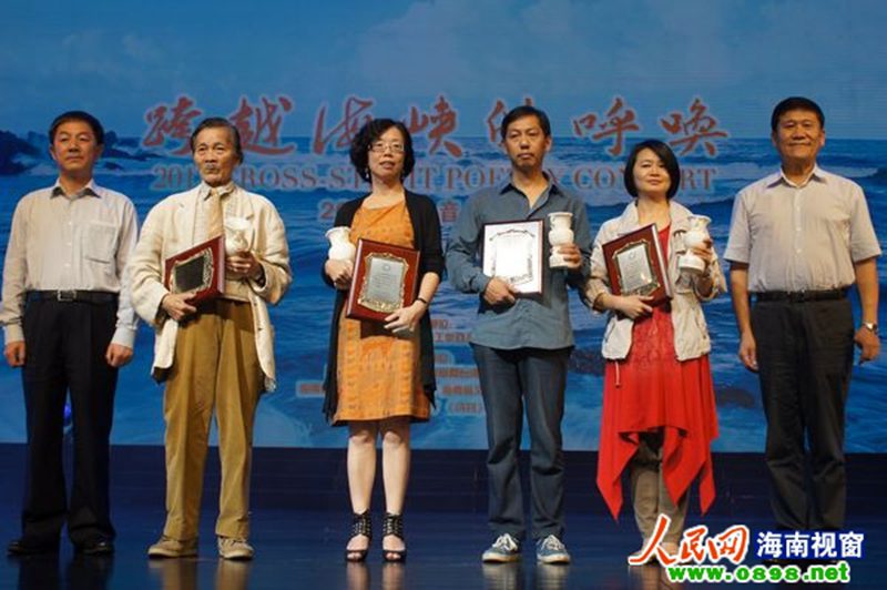 中央台办副主任叶克冬(左一)和海南省委副书记李宪生(右一)为罗门、舒婷、颜艾琳、潘维颁发了两岸诗歌桂冠奖项
